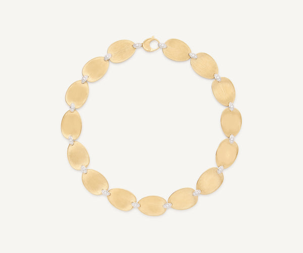 A contemporary take on the iconic Lunaria design, this necklace introduces the refined sparkle of pav�� diamonds to the collection���s signature organic shapes. Handcrafted 18kt yellow gold leaves, finely hand-engraved using the ancient Florentine technique, are interspersed with delicate diamond accents, creating a seamless balance of sophistication and brilliance.