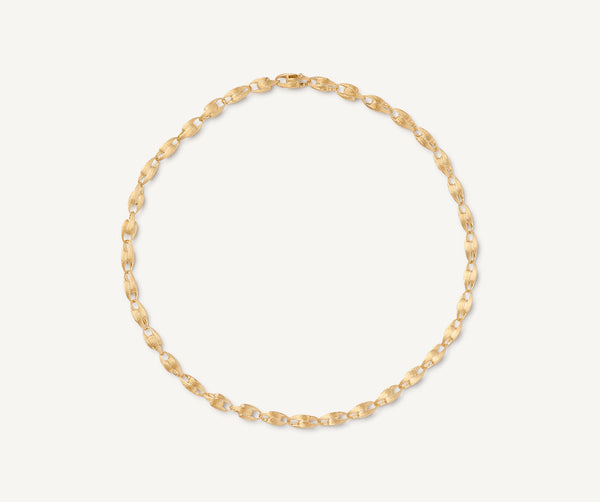A marvelous 18kt yellow gold necklace consisting of a concatenation of elements composed of each other, an endless embrace. The surface is hand-engraved with the ancient Florentine technique which provides a very tactile finish. A necklace to wear every day, a real must have.