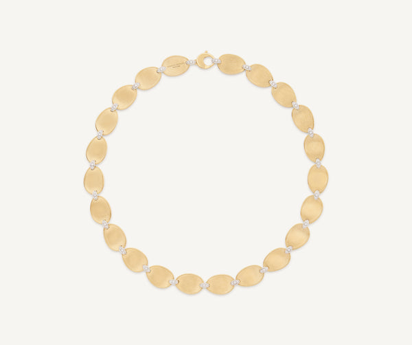A contemporary take on the iconic Lunaria design, this necklace introduces the refined sparkle of pav�� diamonds to the collection���s signature organic shapes. Handcrafted 18kt yellow gold leaves, finely hand-engraved using the ancient Florentine technique, are interspersed with delicate diamond accents, creating a seamless balance of sophistication and brilliance