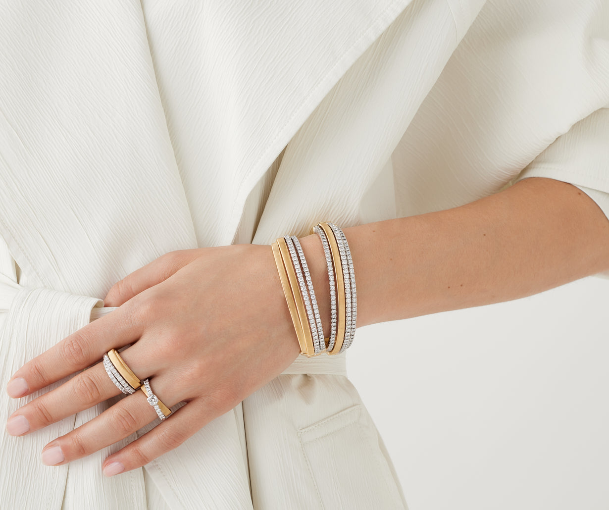 The perfect match between the elegance of the coil and the light of diamonds: crafted in 18K yellow gold, this single strand flat coil cuff features three sparkling rows of round brilliant cut diamonds. With its stunning design, it is a piece of jewelry that cannot go unnoticed.