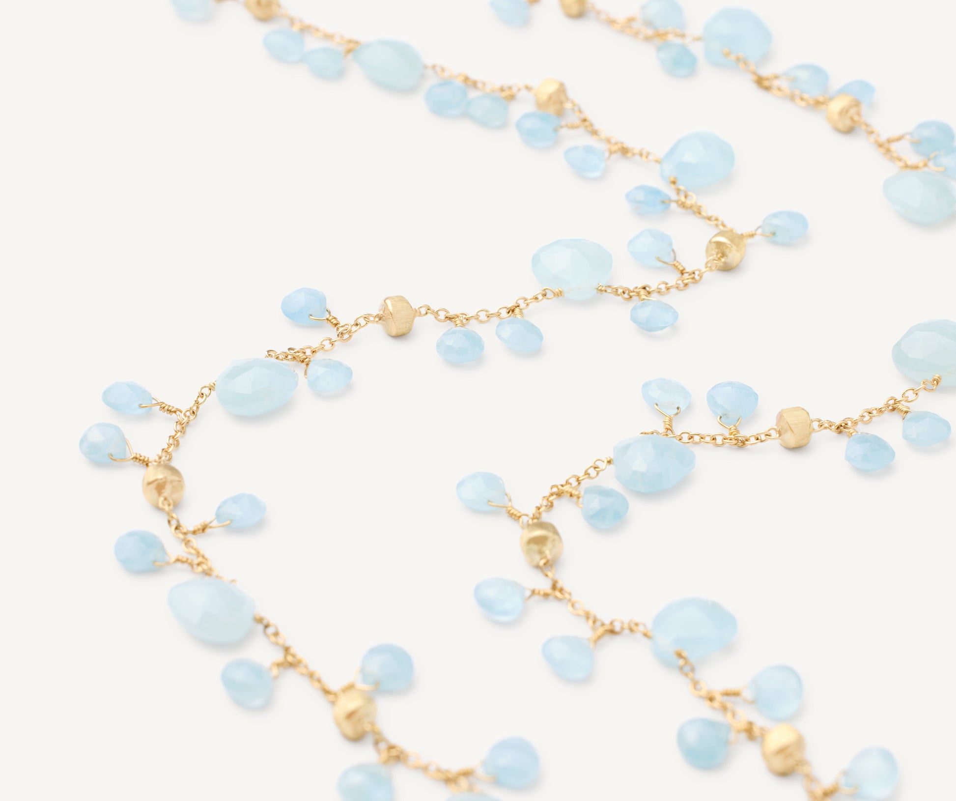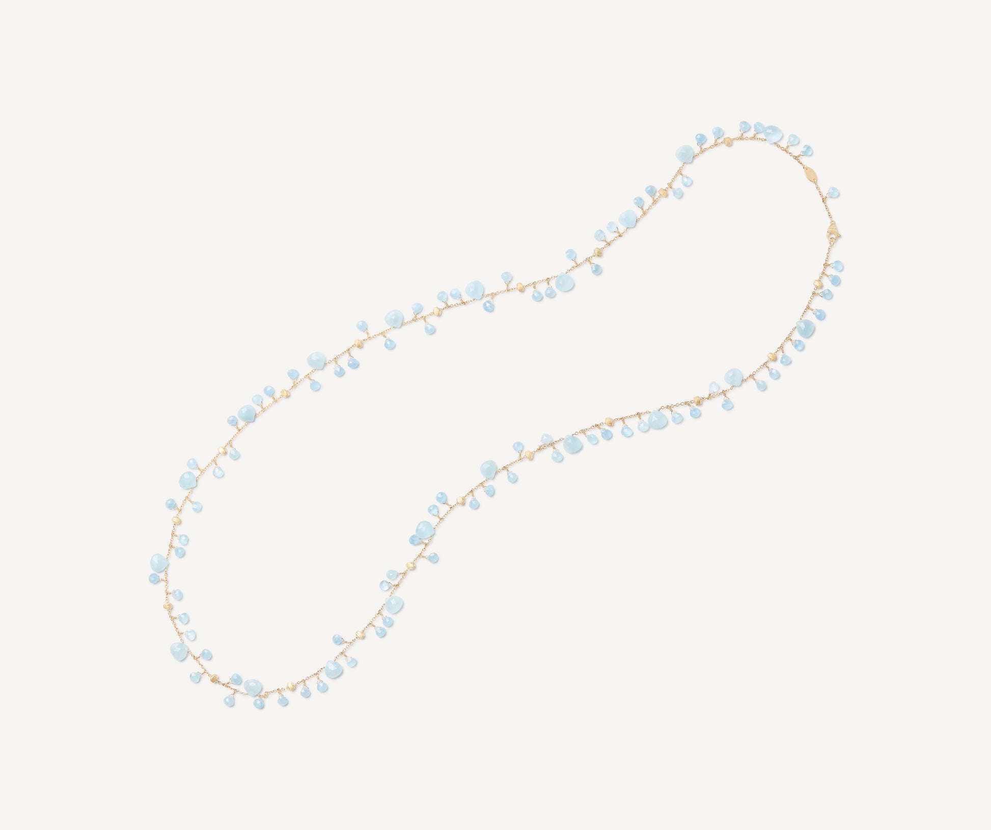 In this long necklace, heart-cut milky aquamarines are interspersed with small 18K yellow gold nuggets, finely hand-engraved using the ancient Florentine technique. Perfect even when doubled, it exudes a certain ���je-ne-sais-quoi��� that speaks of lightness, energy, and joy of living.