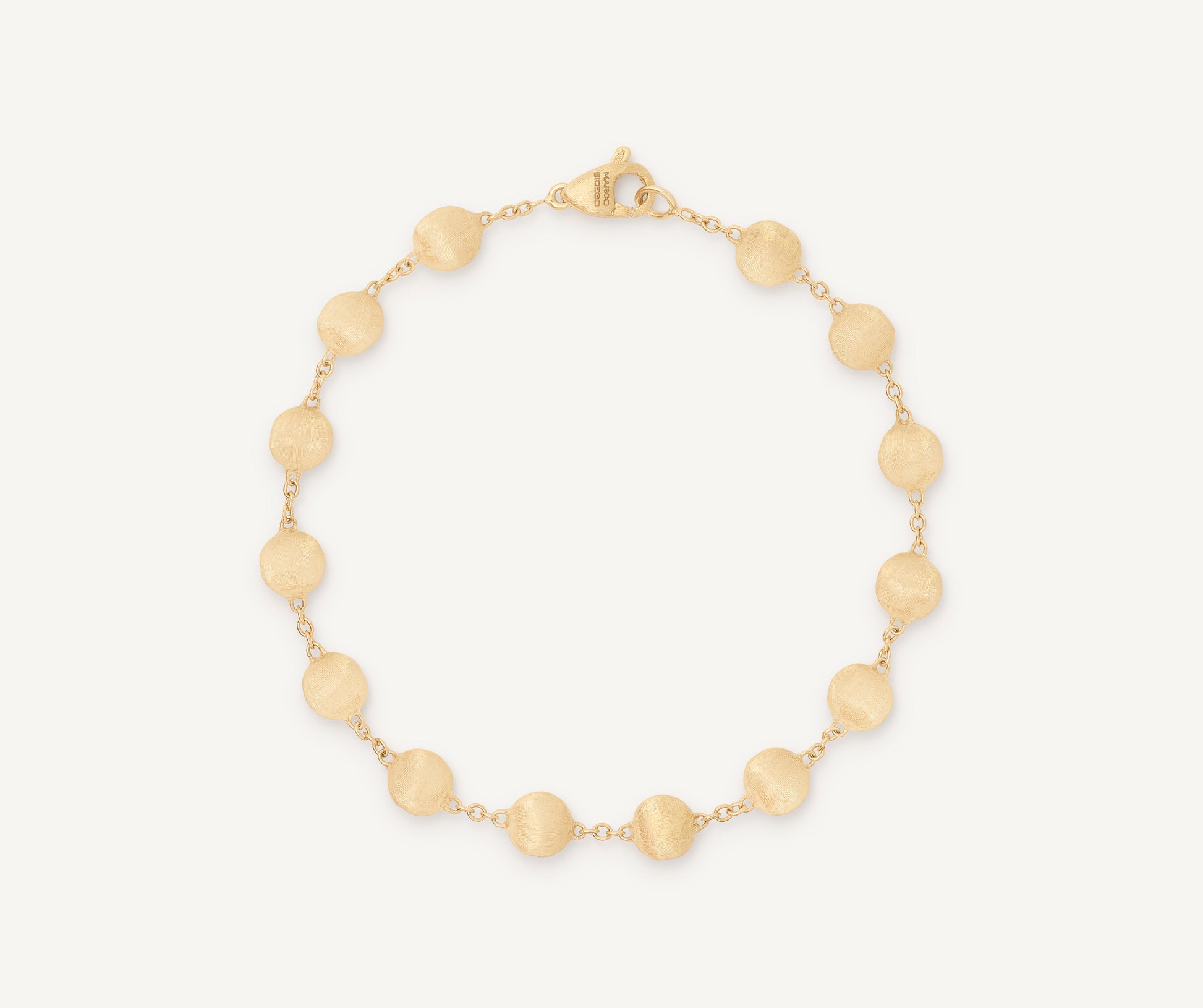 This elegant bracelet features 18K yellow gold beads, all individually hand-engraved and textured with the ancient Florentine technique, giving the gold a fine, brushed texture. The bracelet is completed with a lobster clasp. The perfect touch for your everyday look.