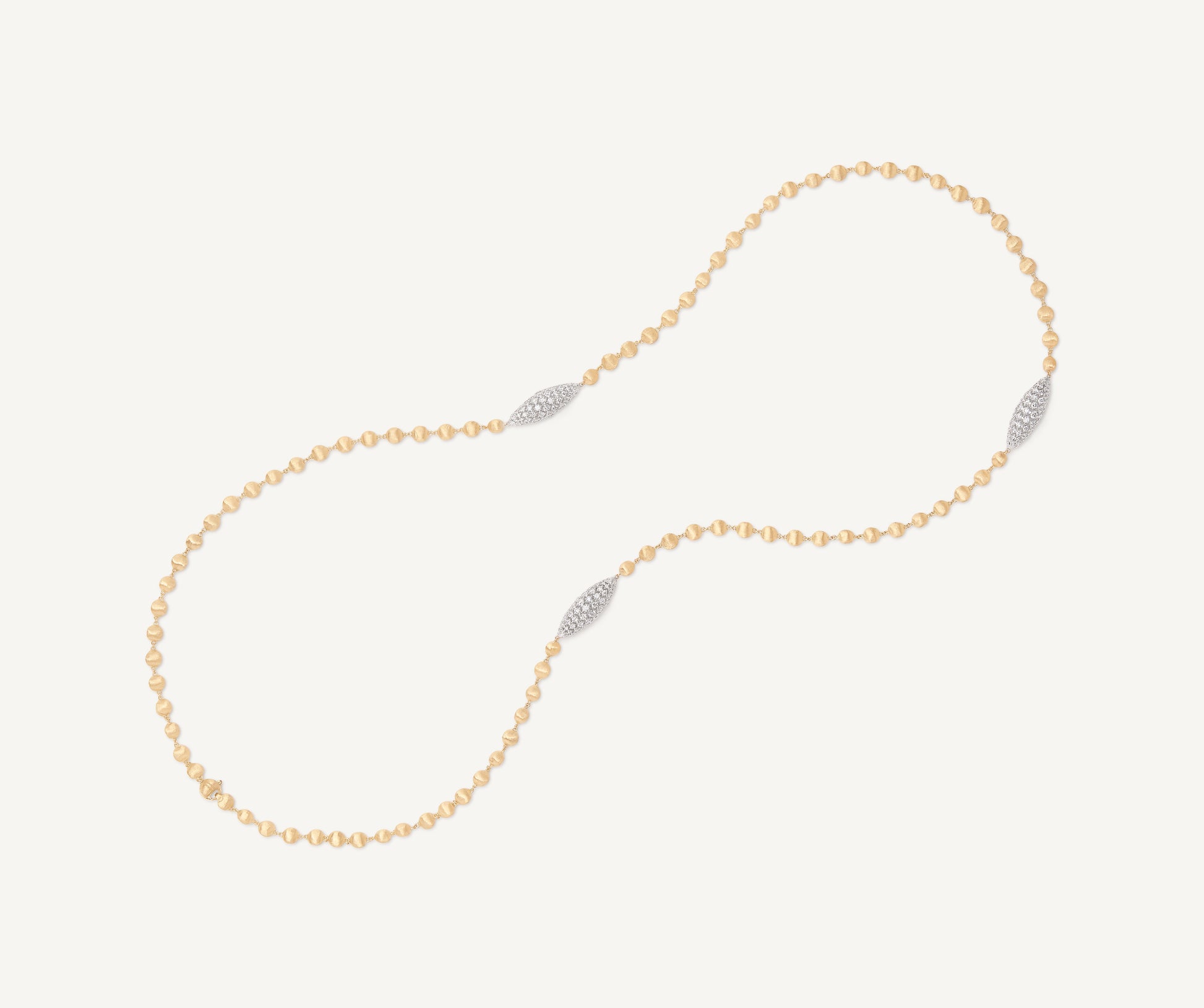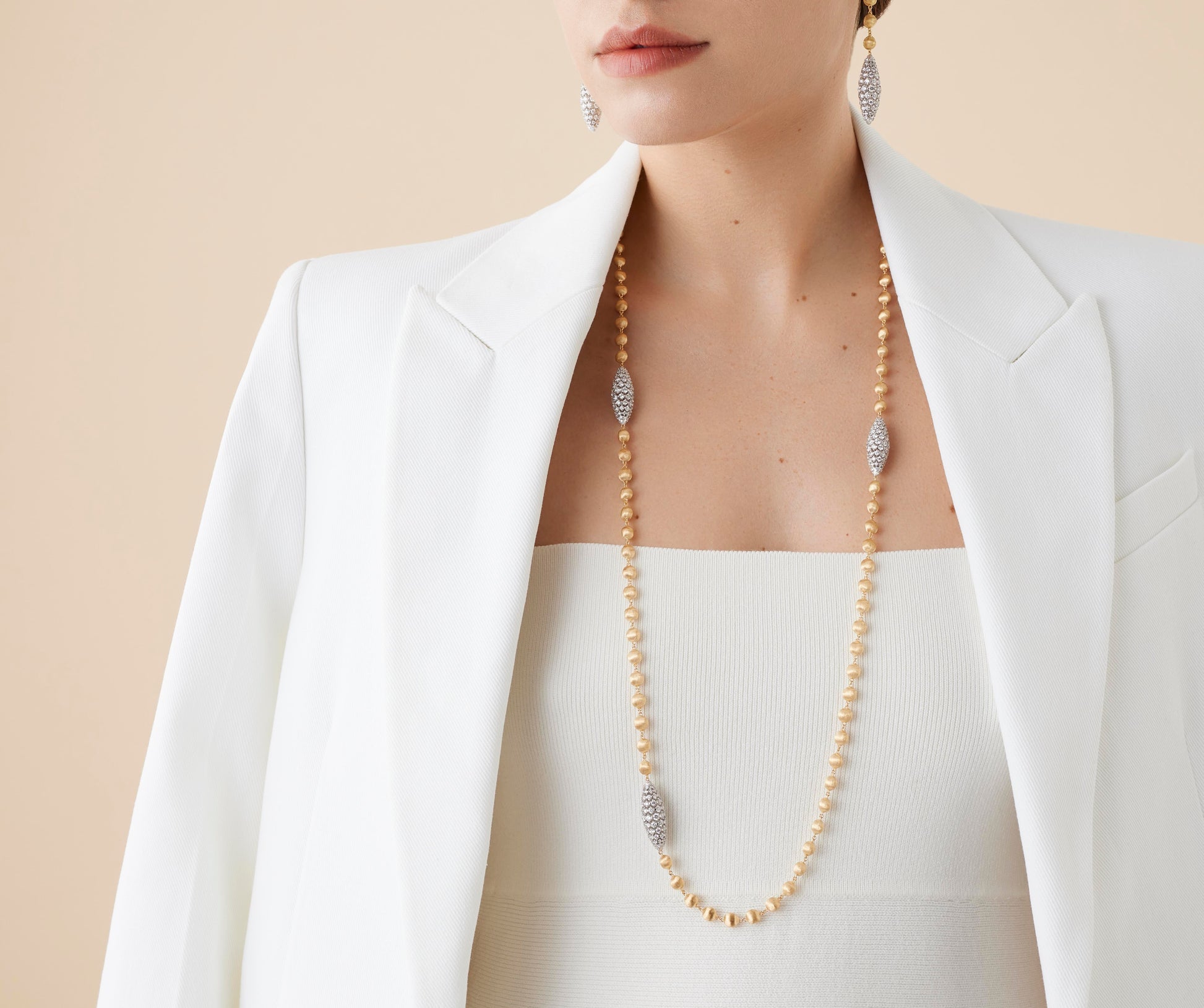This stunning long necklace stands out for its sequence of 18K yellow gold beads alternating with eye-catching oval shape pav��-set diamond elements. The irregular surface is hand-engraved using the ancient Florentine technique. A transformable piece, this jewel may be worn in several ways, including long on a single chain or short with a doubled chain.