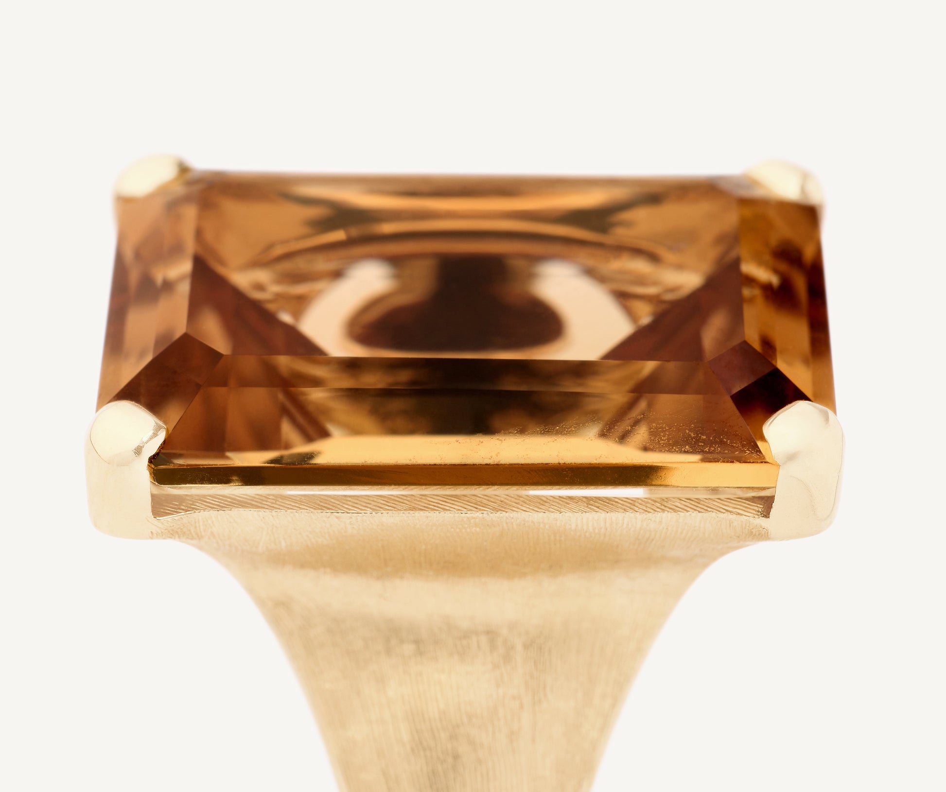 This elegant 18K yellow gold cocktail ring is finely hand-engraved using the ancient Florentine technique, which gives our gold a fine, brushed texture. Set in luxurious elegance, the emerald-cut champagne quartz centerpiece captivates with its mesmerizing hue, adding a touch of regal allure to your ensemble.