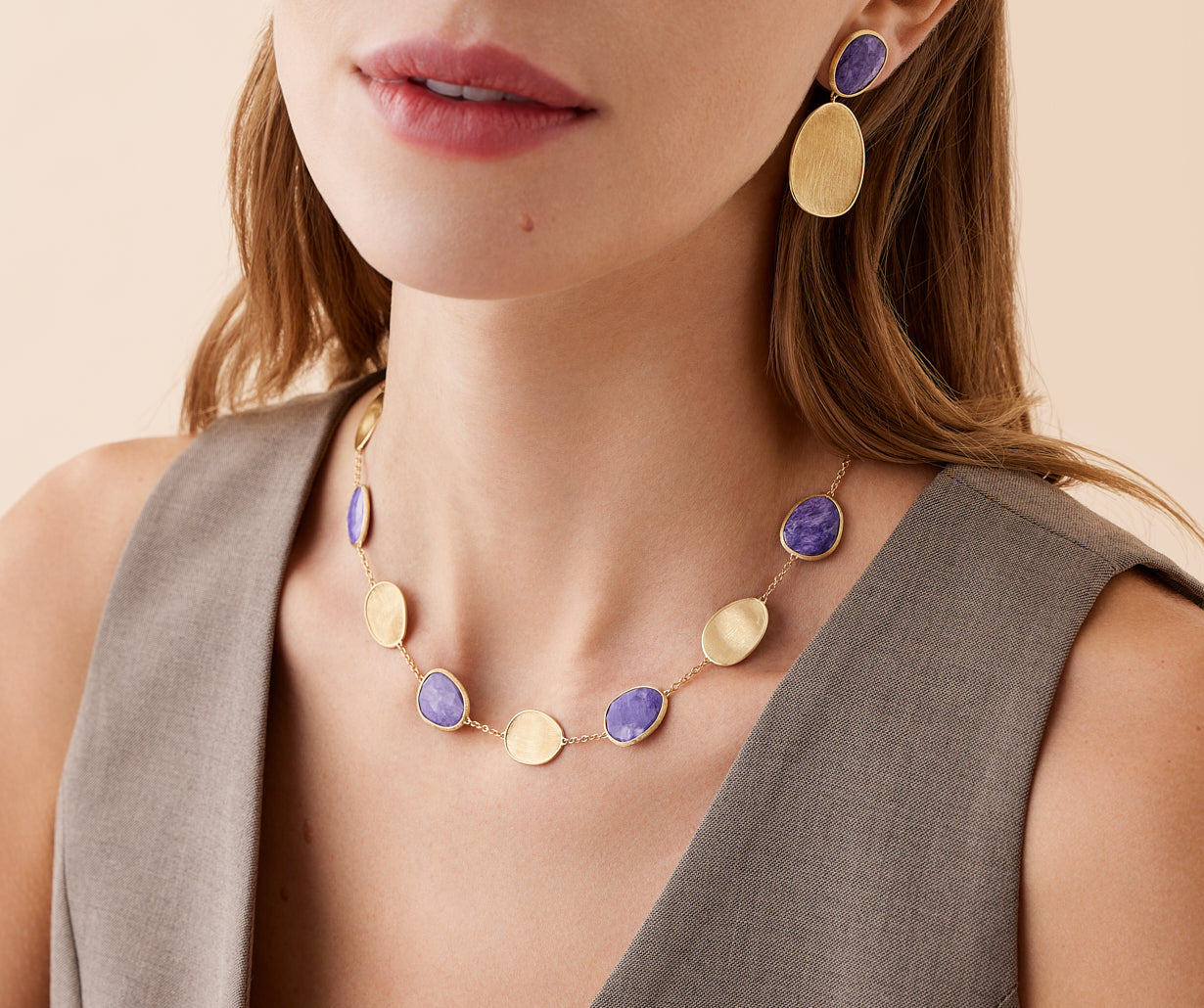 Elegant and striking, this necklace features a refined sequence of light 18K yellow gold leaves and purple charoite. The gold leaves are meticulously hand-engraved using the ancient Florentine technique, interspersed with a delicate chain. The perfect piece to complete any look with a vibrant touch of color.