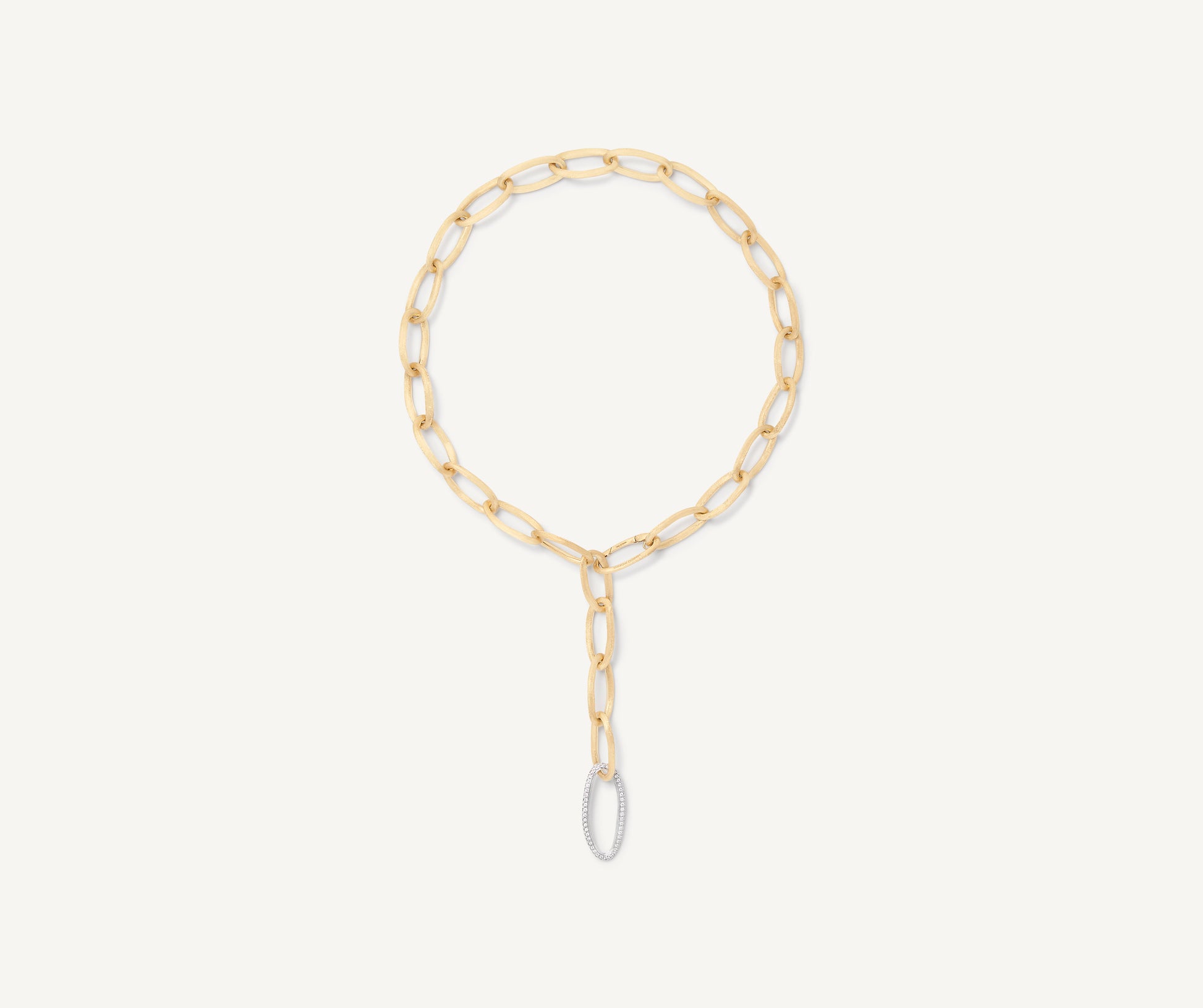 This boldly styled lariat necklace can be worn in a variety of ways and lengths. Crafted from 18K yellow gold, it is finely hand-engraved using the ancient Florentine technique which gives our gold a fine, brushed texture. The lariat is further embellished with a pav�� link of brilliant-cut diamonds, adding a touch of opulence to the design.