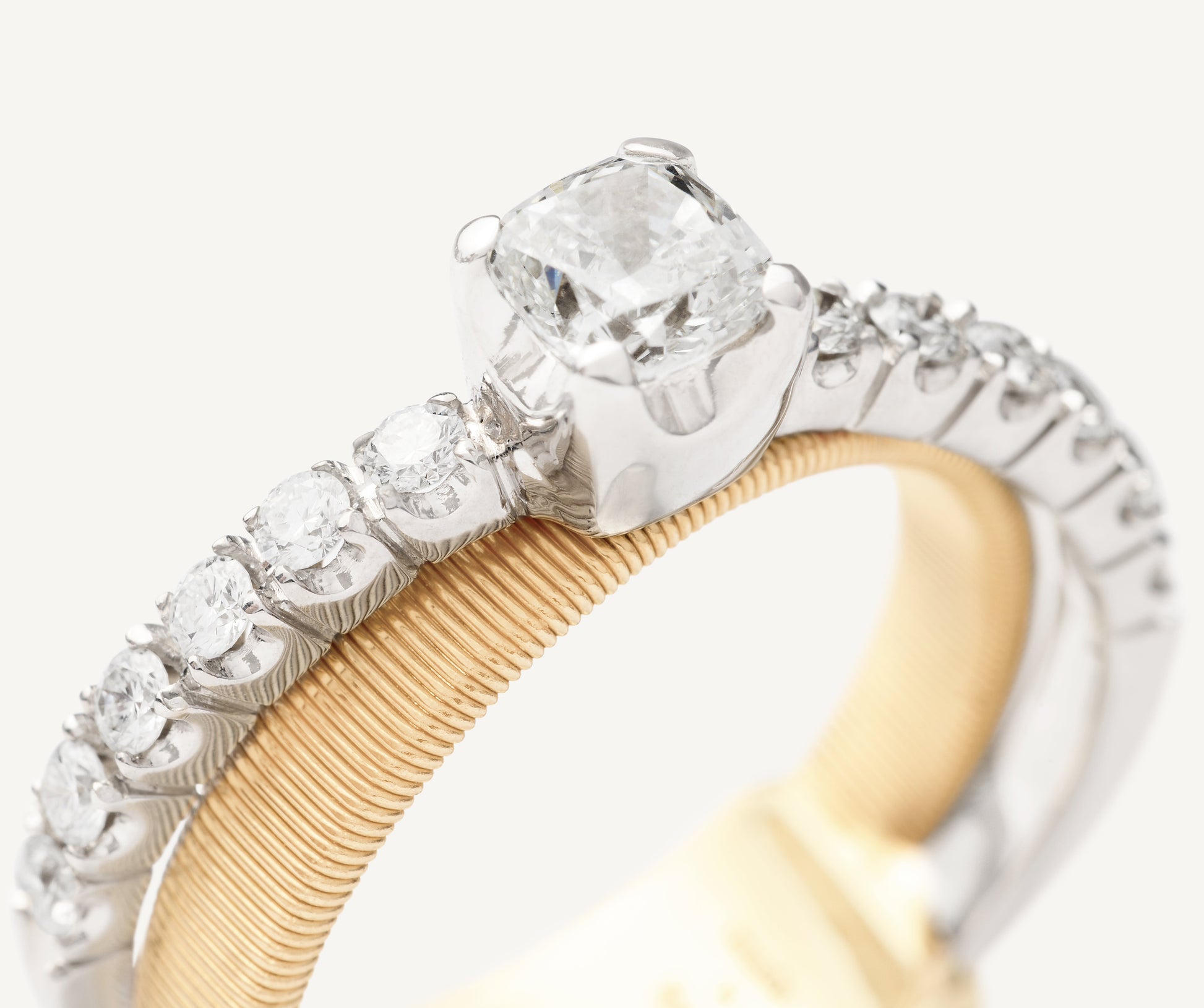 In this elegant 18K yellow gold ring, a carefully selected 0.5ct cushion-cut diamond is nestled on flat coil thread, finely hand-crafted with our exclusive coil technique, and surrounded with an elegant brilliant-cut diamond band. The result is a refined and timeless ring perfect for a heartfelt gift.