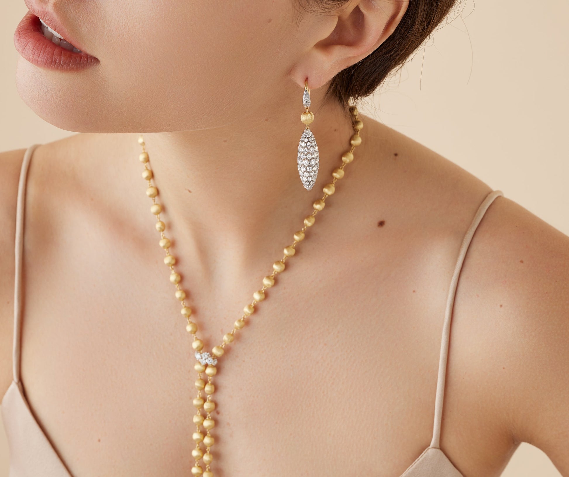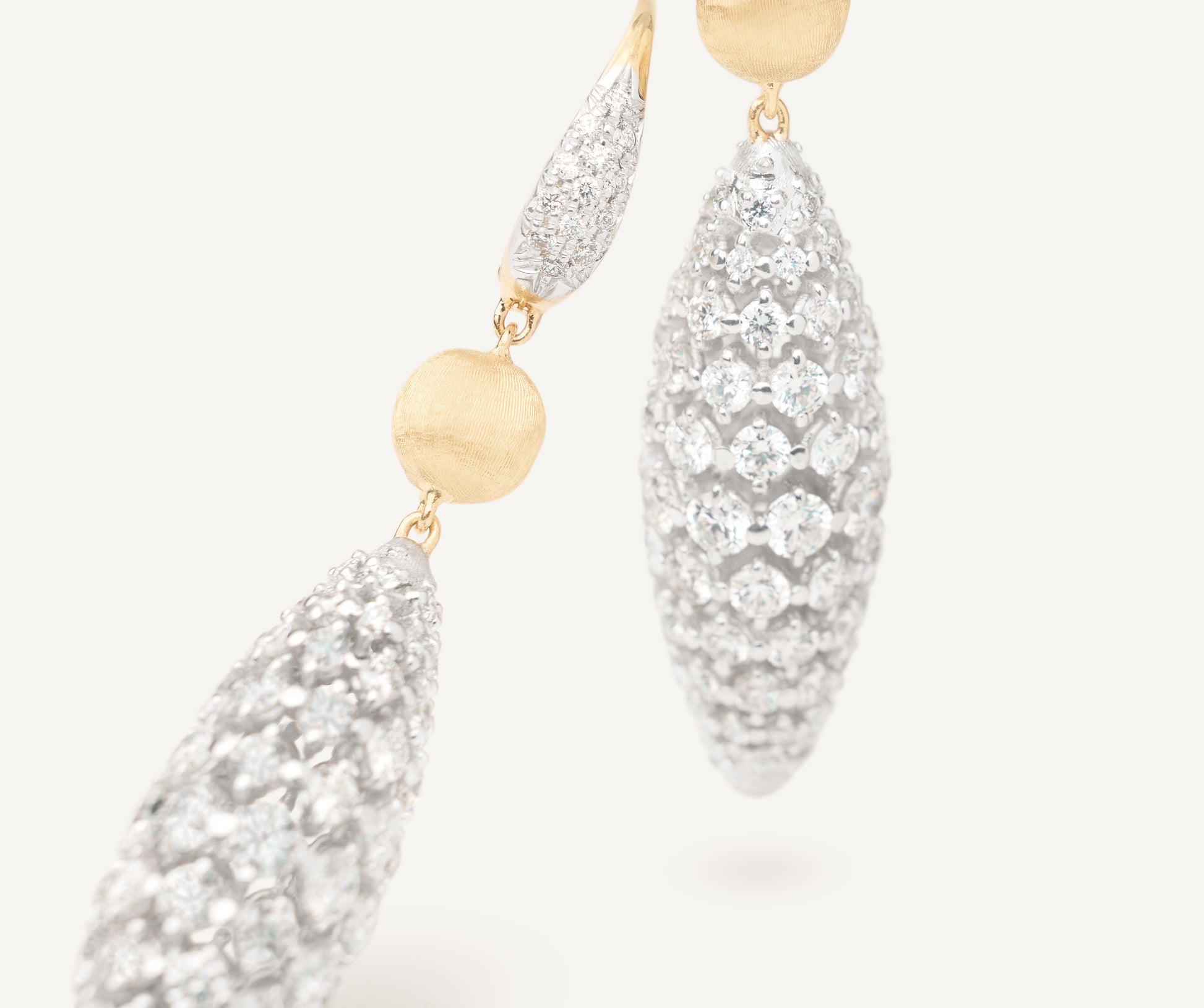 Sophisticated drop earrings featuring an 18k yellow gold bead, finely hand-engraved using the ancient Florentine technique and an eye-catching oval shape pav��-set diamond elements, suspended from graceful pav�� clips. Already a classic.