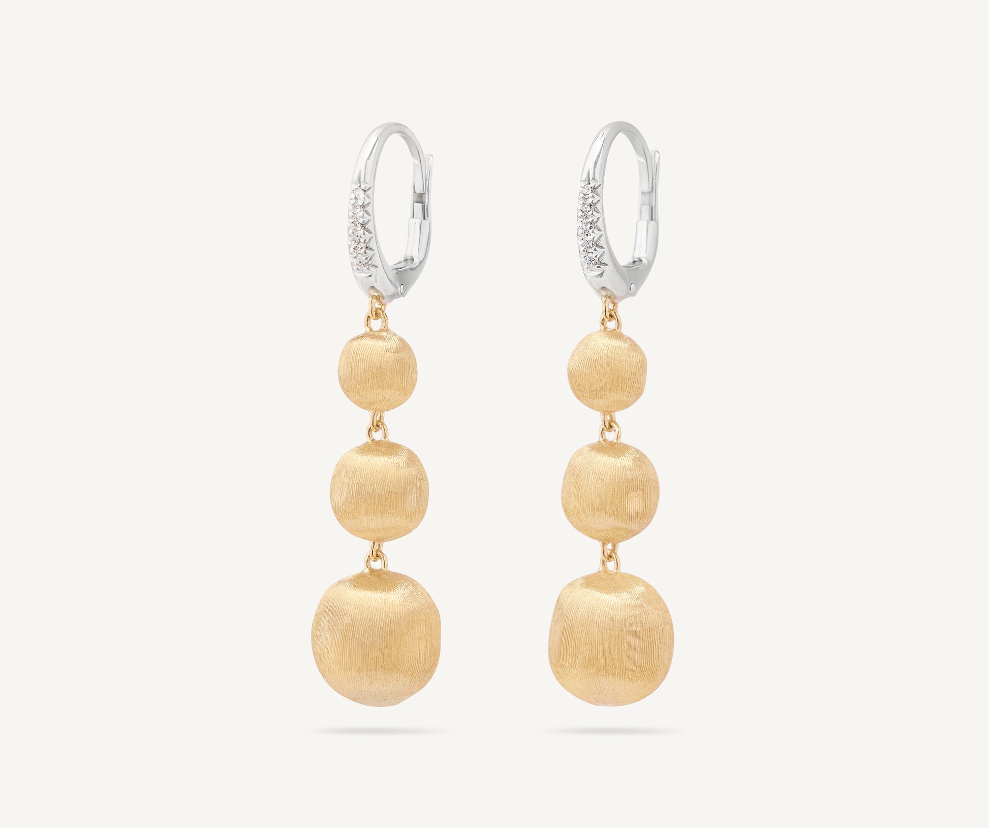 Sophisticated earrings featuring three graduated spheres in 18K yellow gold with an irregular surface, finely hand-engraved using the ancient Florentine technique. Each earring has been set with an elegant diamond pav�� clip.