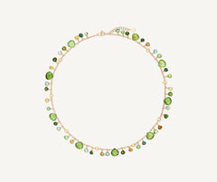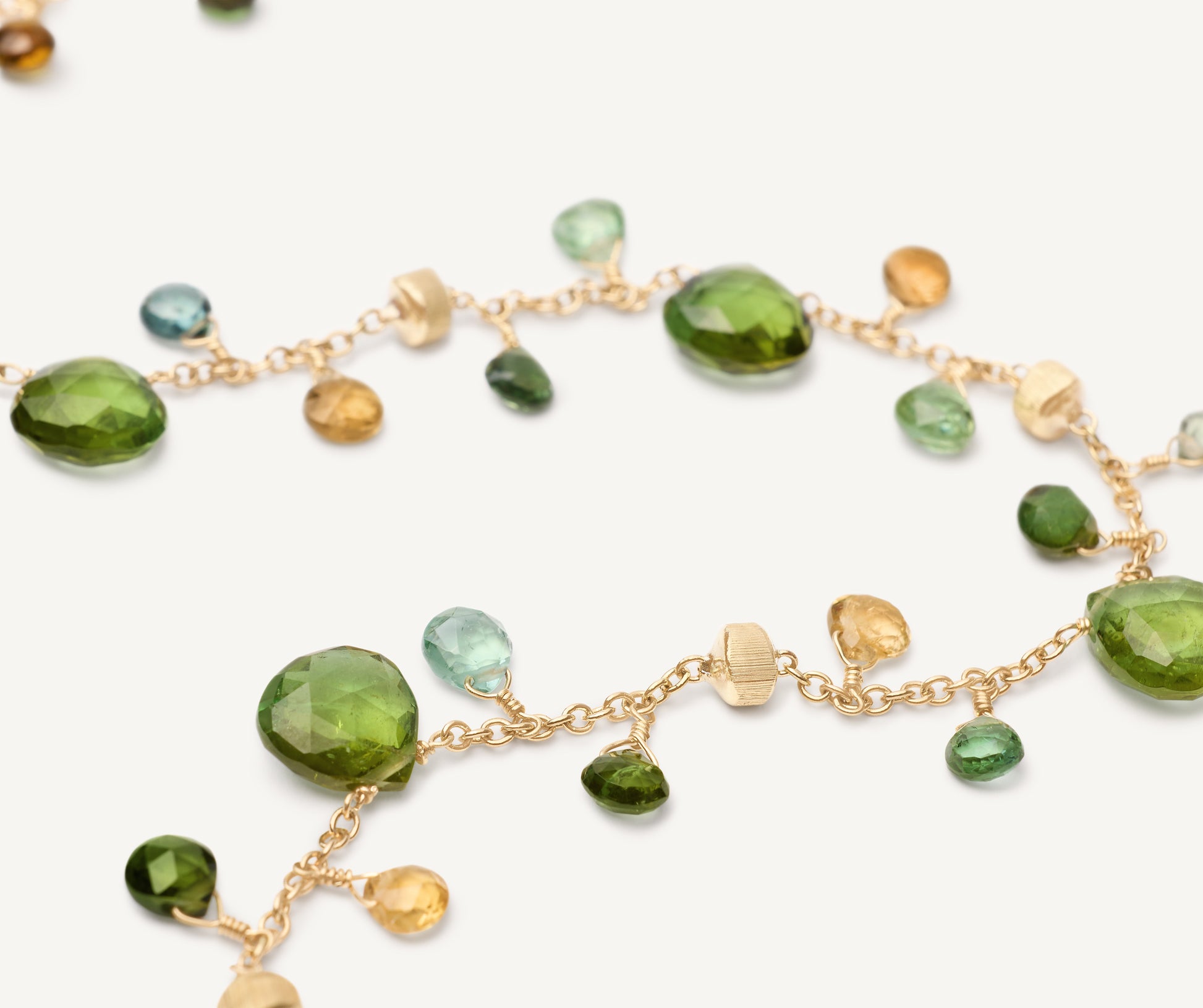 A wondrous shade of sparkling green, this single-strand necklace features a sequence of heart-cut green tourmalines alternating with precious 18K yellow gold nuggets, finely hand-engraved using the ancient Florentine technique.