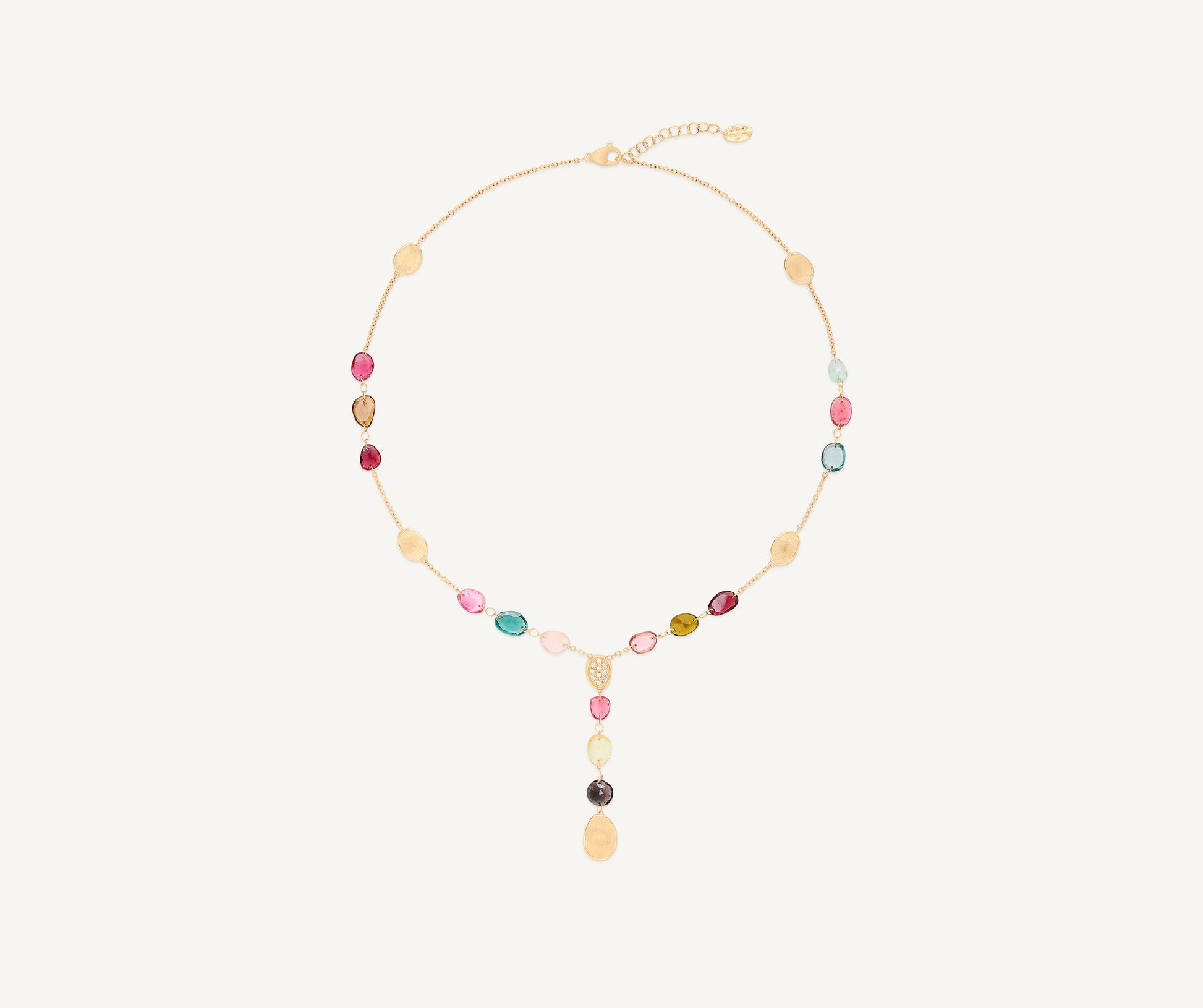 An elegant 18K yellow gold lariat necklace, adorned with gold leaves delicately hand-engraved using the ancient Florentine technique, alternating with vibrant tourmalines. This necklace features an adjustable chain, offering a customizable fit for every neckline. The perfect jewel to infuse any ensemble with a sophisticated touch of color.