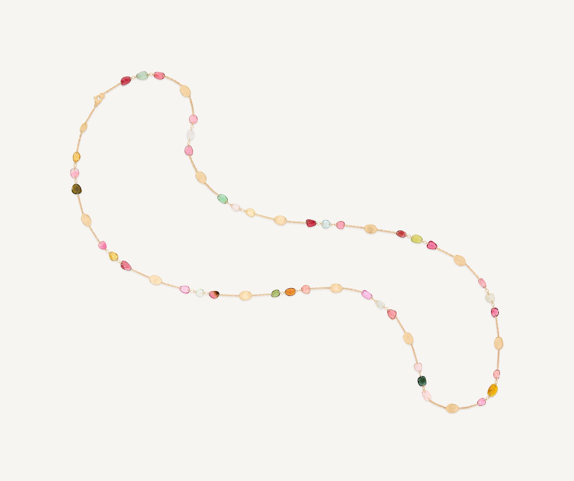 An elegant 18K yellow gold long necklace, adorned with gold leaves delicately hand-engraved using the ancient Florentine technique, alternating with vibrant tourmalines. The perfect jewel to infuse any ensemble with a sophisticated touch of color.
