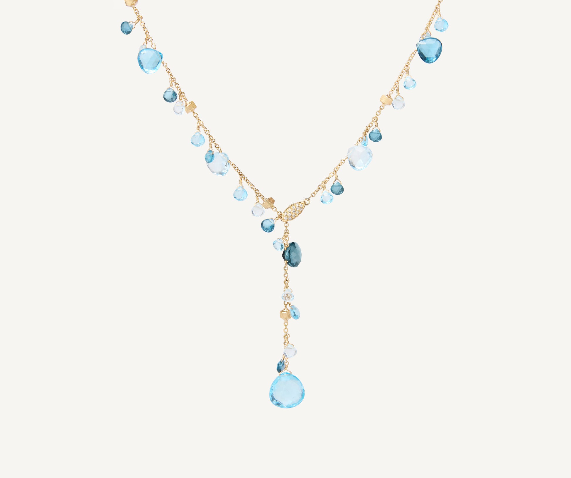Fresh and sophisticated in look, this lariat necklace features carefully selected heart-cut topazes and small 18K yellow gold nuggets, finely hand-engraved using the ancient Florentine technique. A special lever clasp, featuring a brilliant-cut diamond pav��, makes it possible to change the necklace���s length at will and to wear it in a variety of combinations.