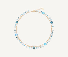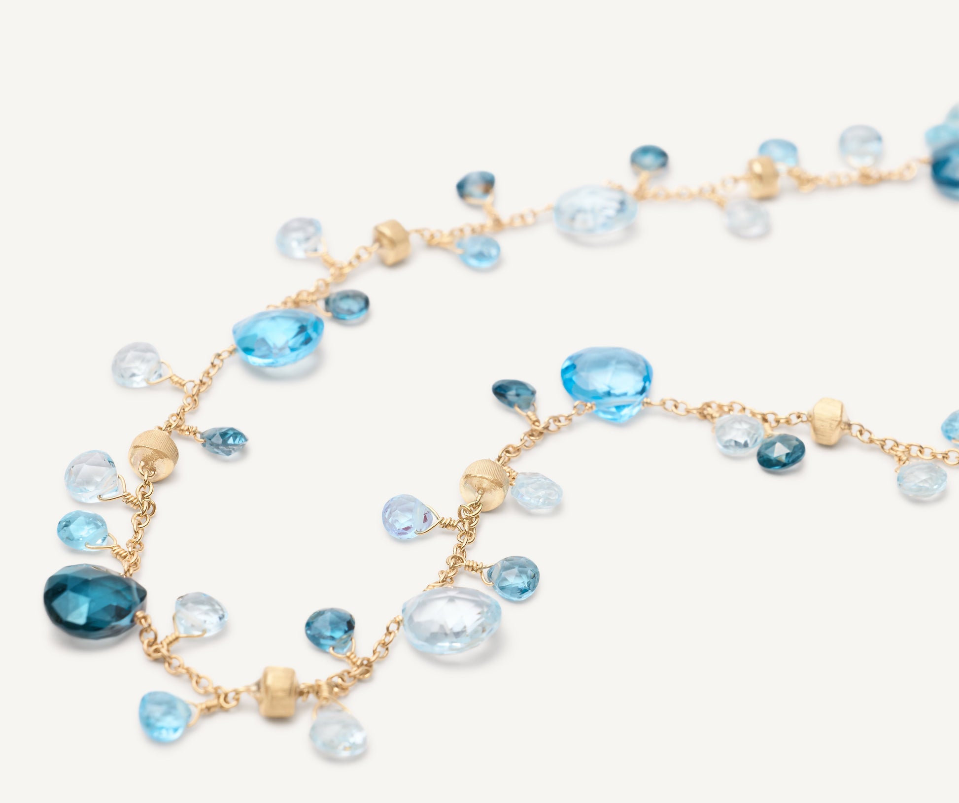 Characterized by infinite shades of blue, this necklace features a sequence of natural heart-cut topazes interspersed by precious 18K yellow gold nuggets, finely hand-engraved using an ancient Florentine technique.