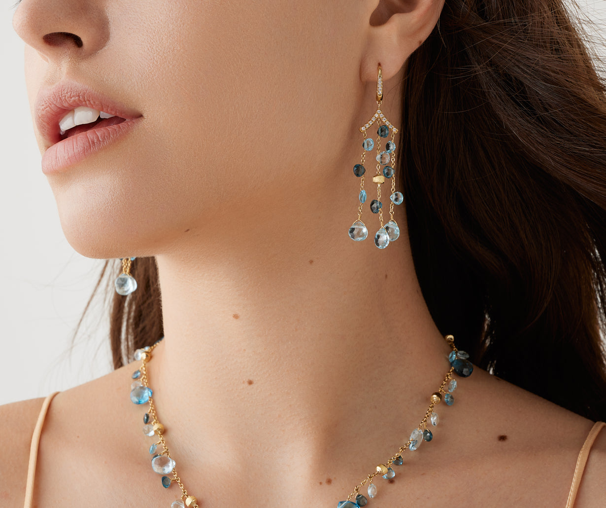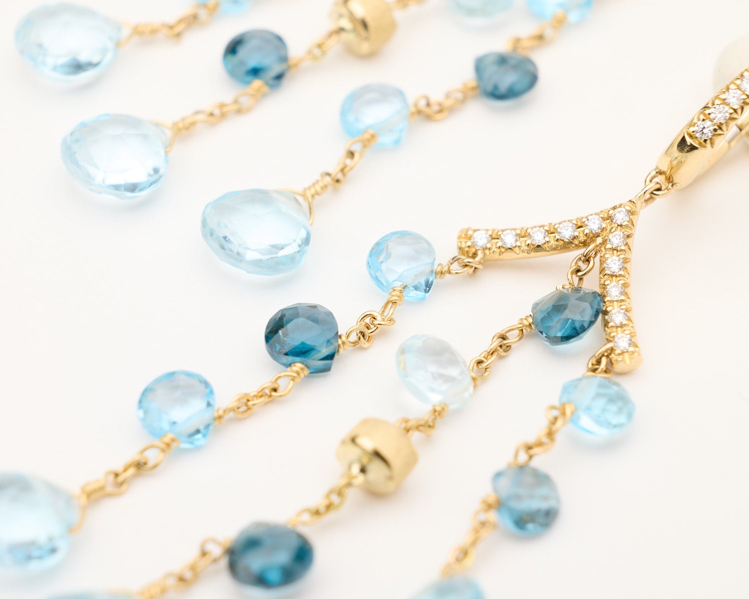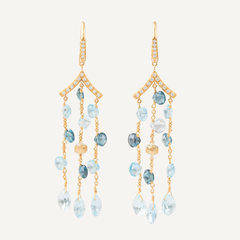 These beautiful earrings are characterized by a cascade of mixed heart-cut topazes in blue hues. As an additional highlight, the 18K yellow gold hook with diamond pav�� adds extra sparkle to the piece.