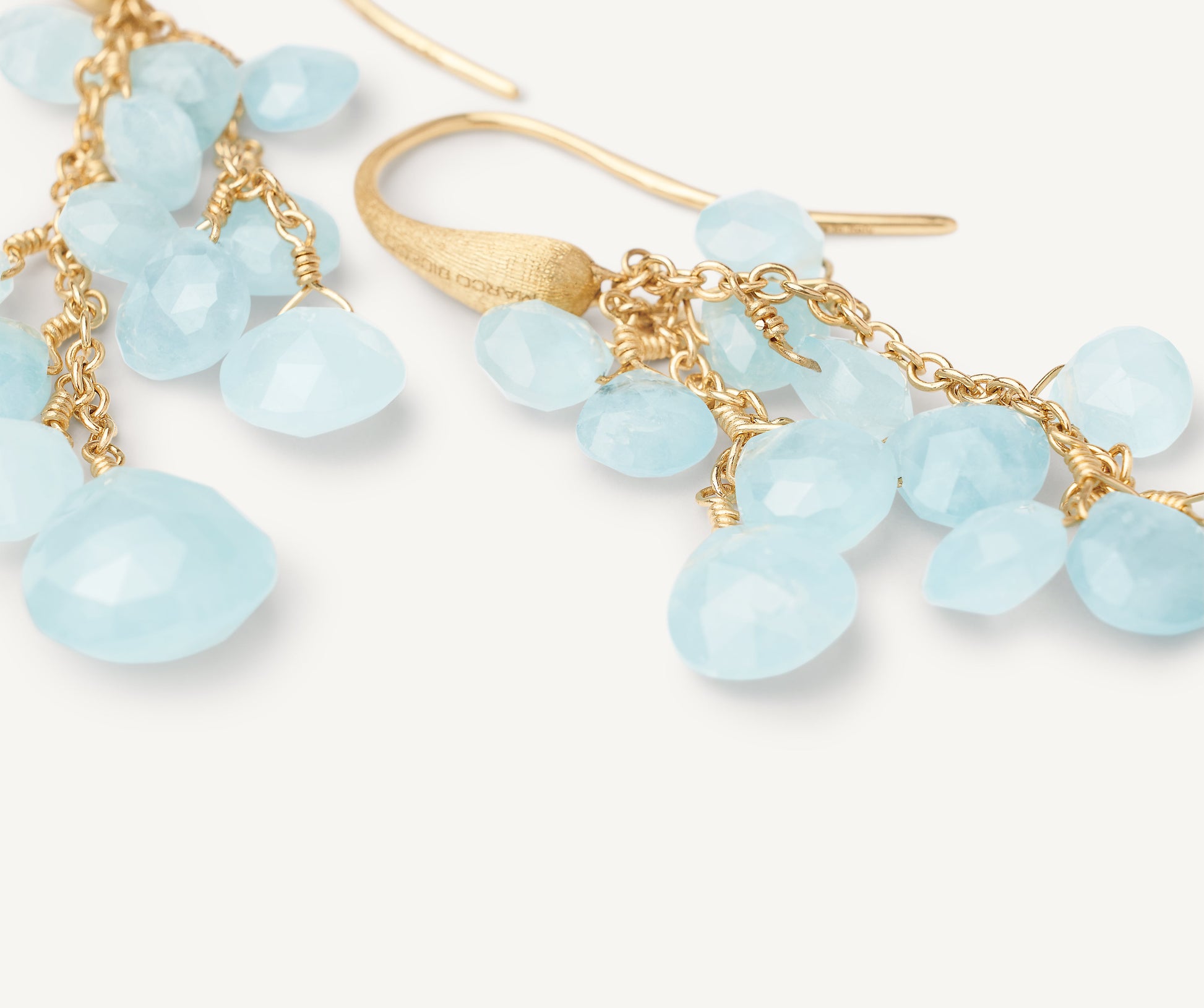Light and elegant, these pendant earrings feature a cascade of selected heart-cut milky aquamarines. With their delicate grace, they add a touch of extraordinary elegance to every look. The 18K yellow gold hook is hand-engraved using the ancient Florentine technique.
