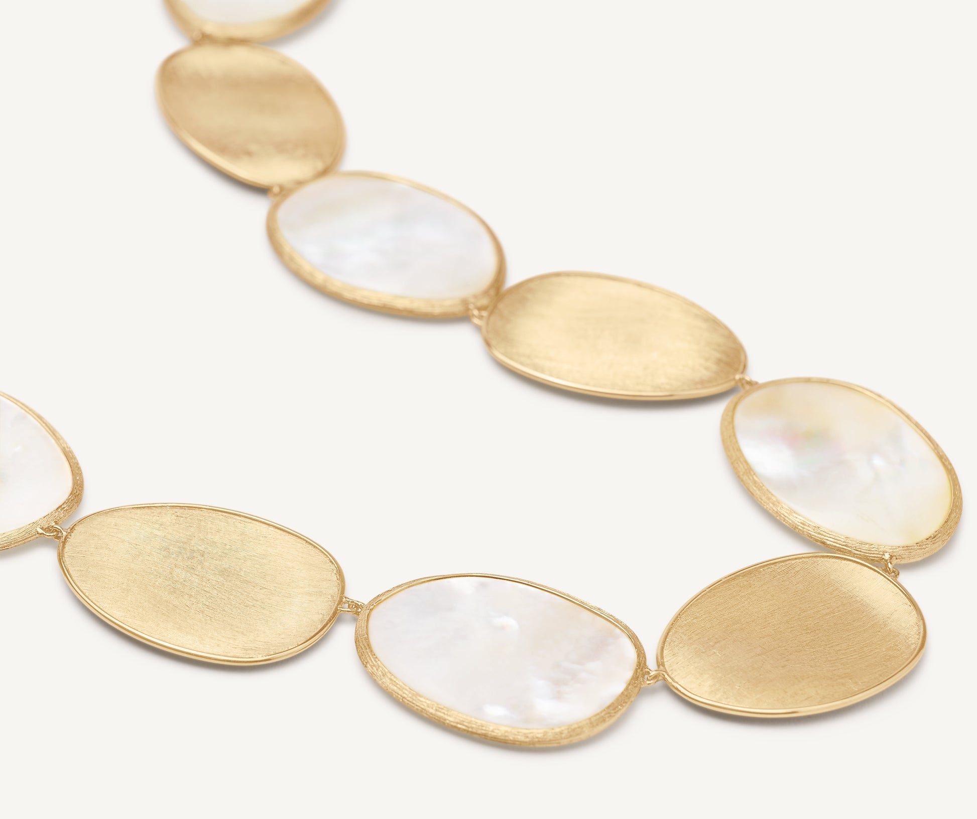 A stunning blend of elegance and art, this necklace comprises a regular sequence of light 18K yellow gold leaves and mother of pearl. The gold leaves are hand-engraved using the ancient Florentine technique. Perfect to complete any look and add a finishing touch of light.