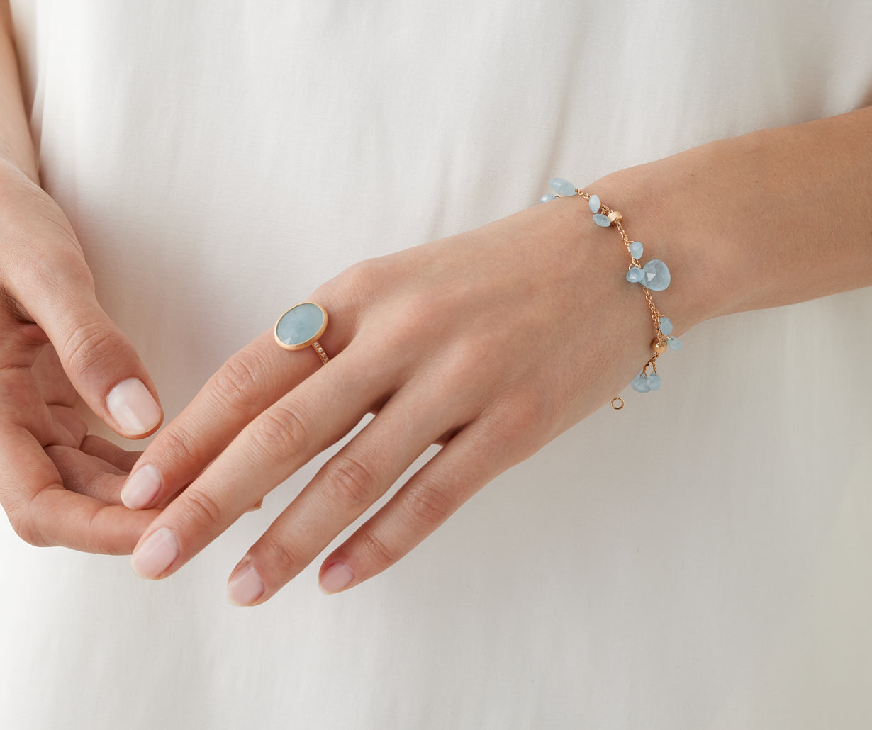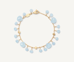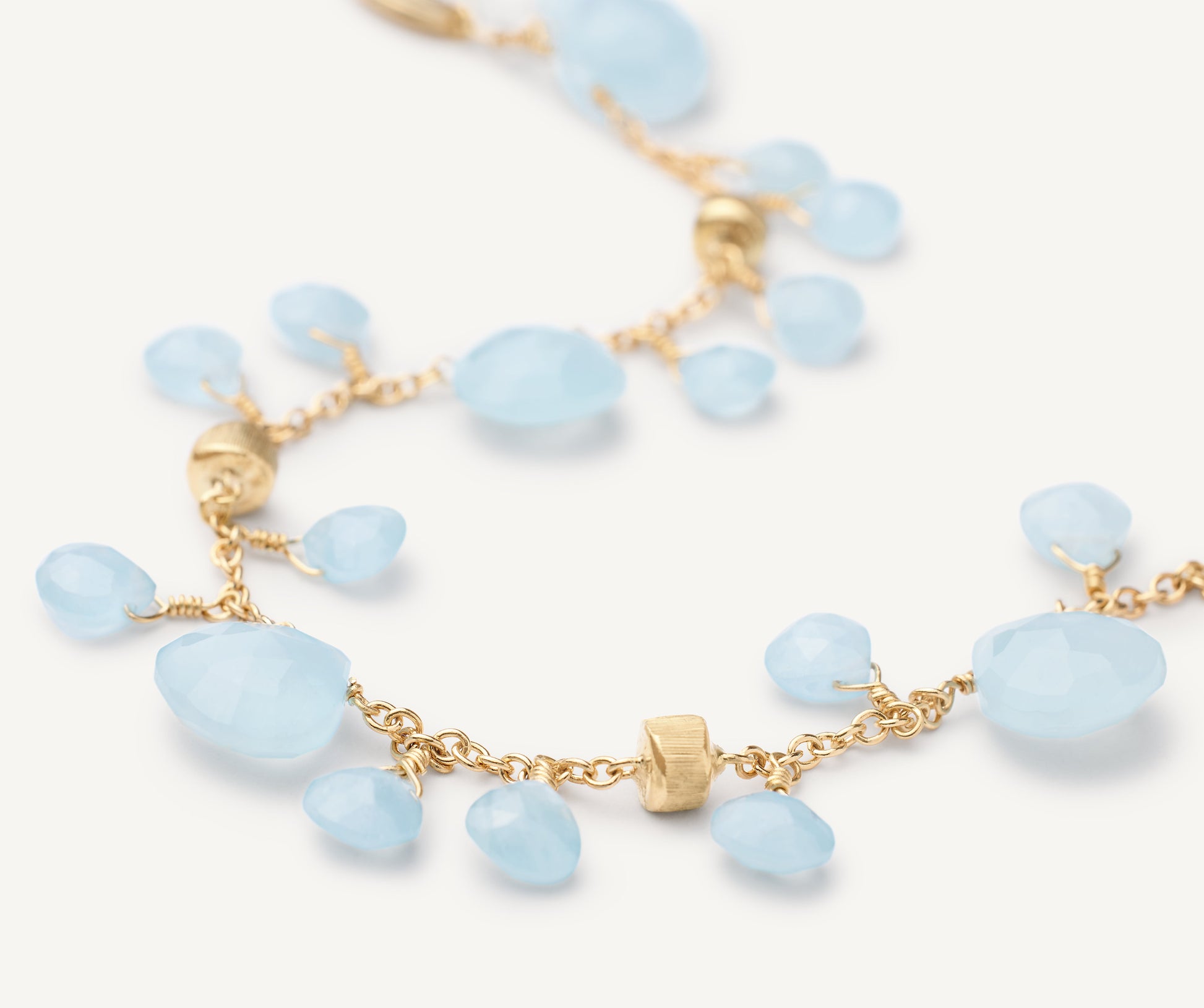 A light, elegant 18K yellow gold bracelet embellished with carefully selected heart-cut milky aquamarines. The 18K yellow gold nuggets are finely hand-engraved using the ancient Florentine technique. Versatile and perfect for adding a touch of colour to any outfit.