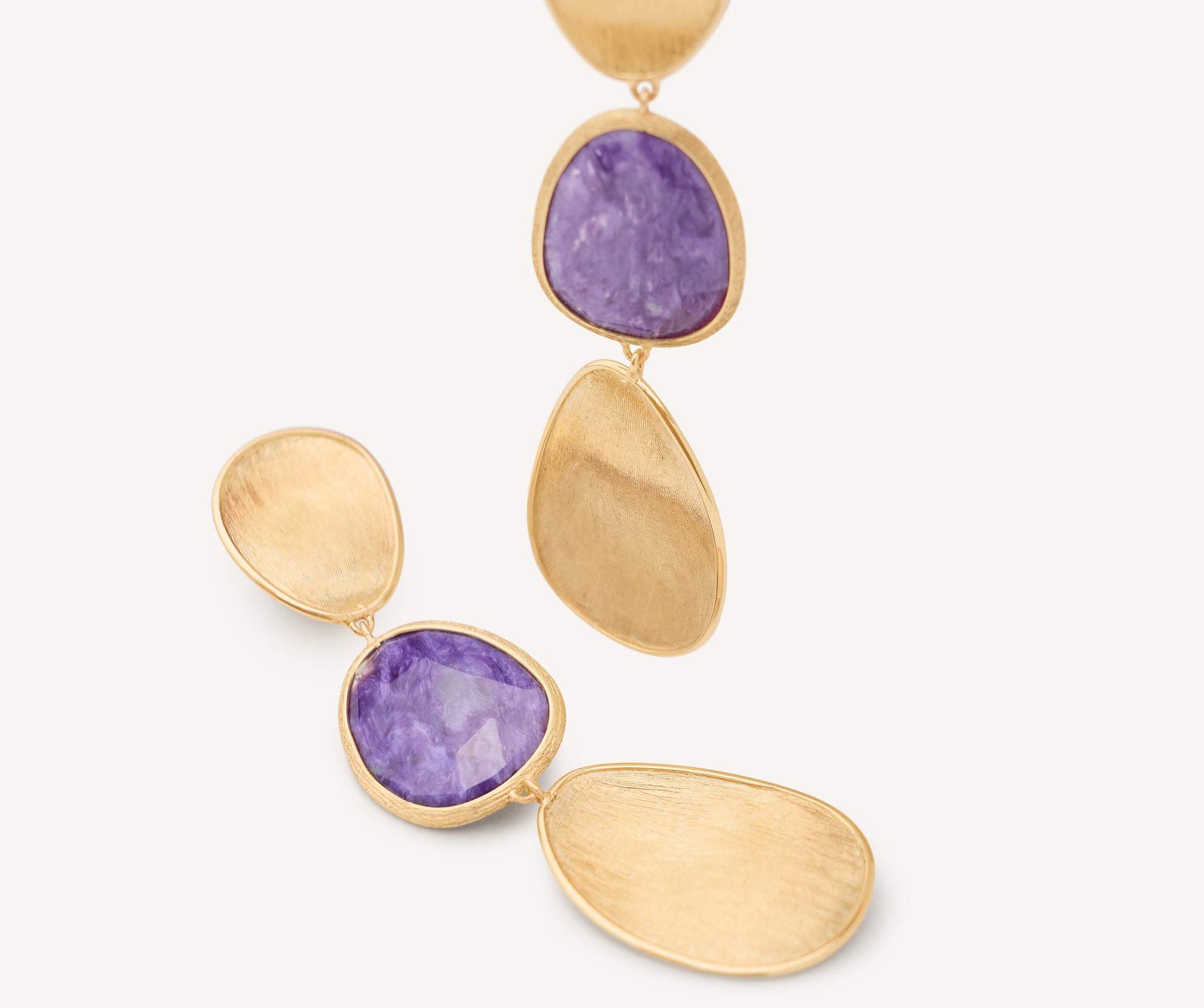 Vibrant and feminine, these triple earrings perfectly balance versatility with understated elegance. The 18K yellow gold leaves are delicately hand-engraved using the ancient Florentine technique, while the central purple charoite leaf features a sophisticated, exclusive cut. The ideal accessory to complete any look with a touch of refined elegance.