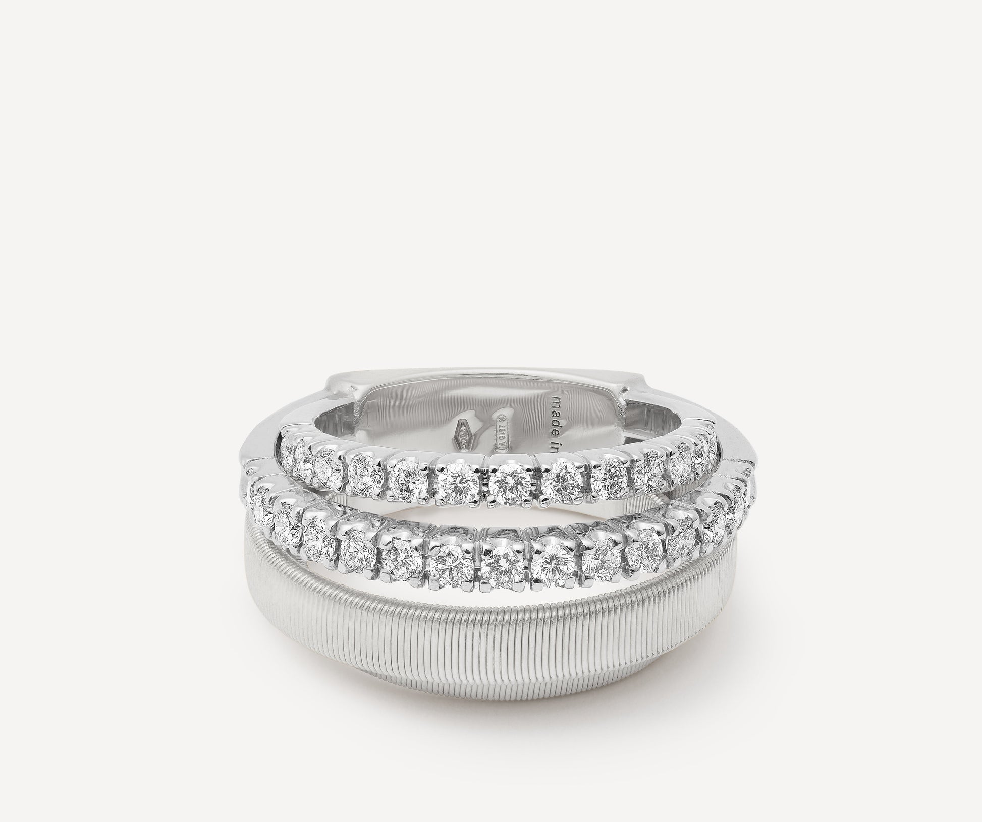 Two brilliant-cut diamond pav bands meet two flat spiral threads, carefully created with the exclusive coil technique. A perfect interweaving for this elegant and sophisticated 18kt white gold ring, a real must-have with timeless appeal.
