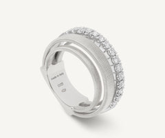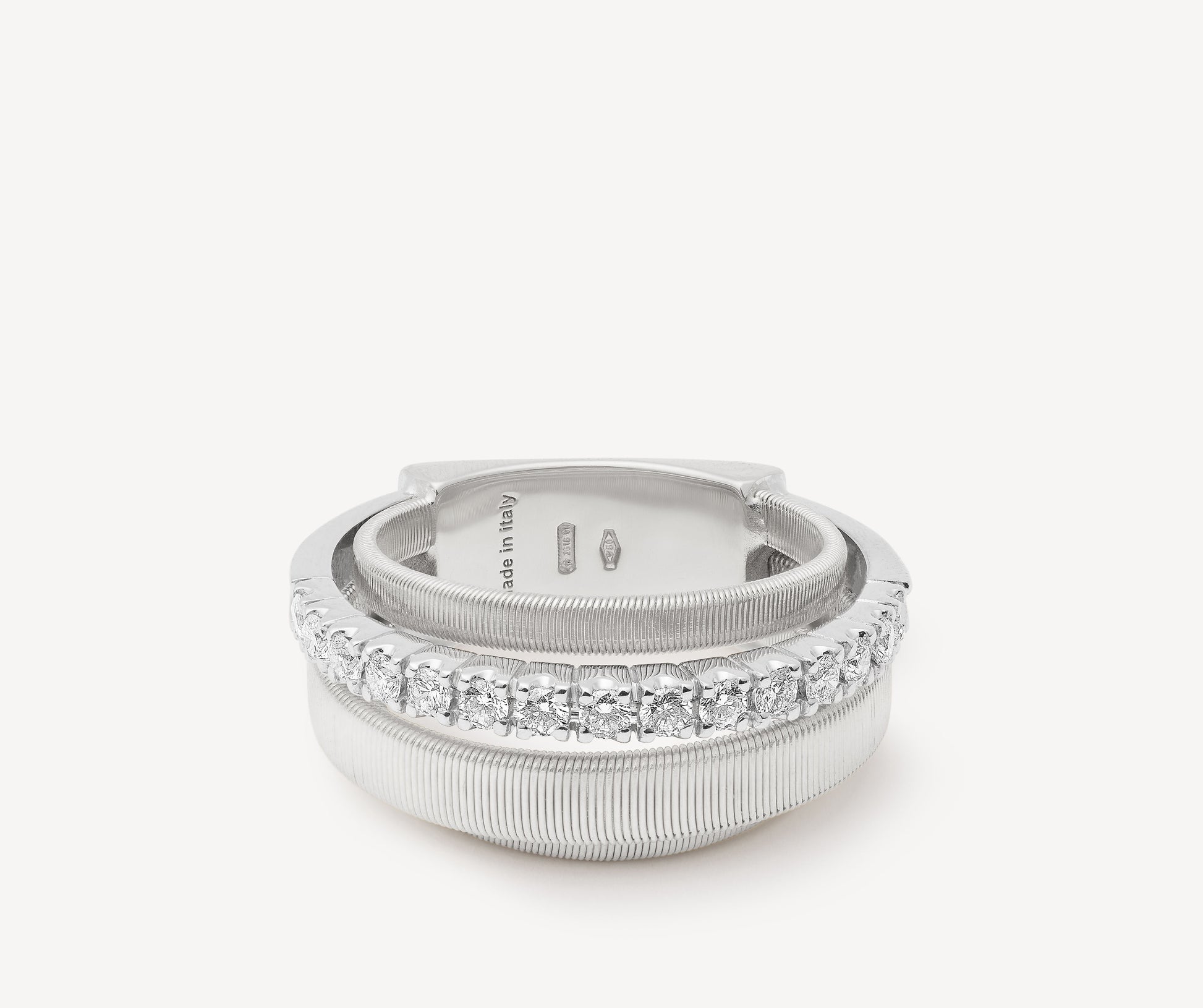 A brilliant-cut diamond pav band meets three flat spiral threads, carefully created with the exclusive coil technique. A perfect interweaving for this elegant and sophisticated 18kt white gold ring, a real must-have with timeless appeal.