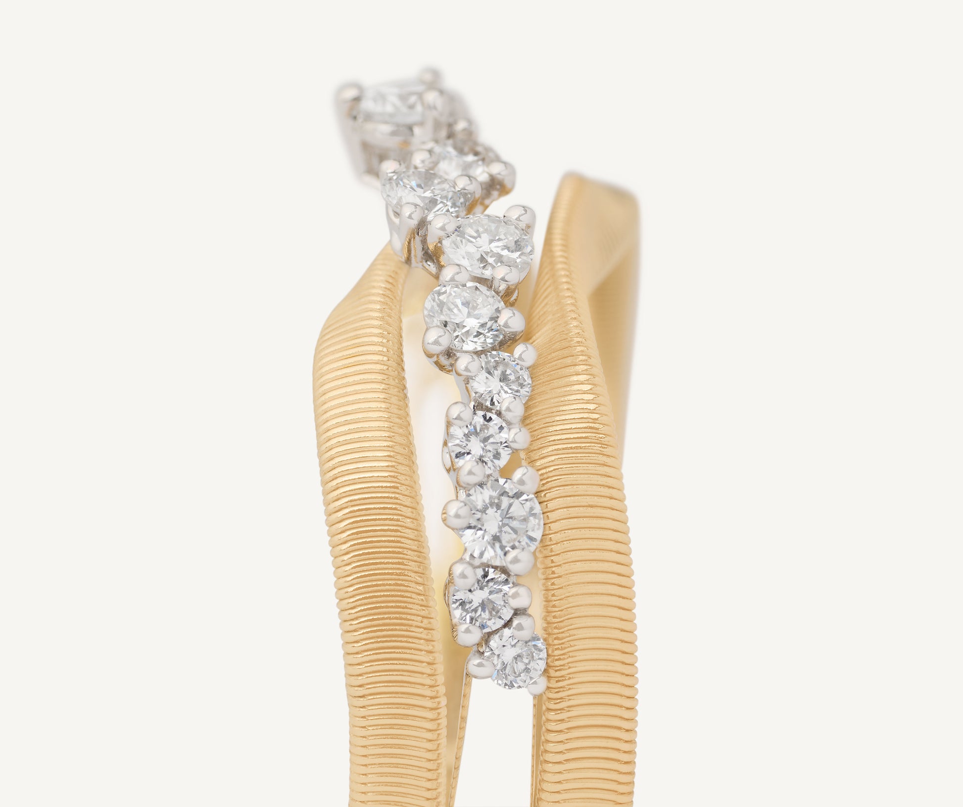 Elegant and refined, this 18kt yellow gold ring showcases two coil strands. A flowing row of brilliant-cut diamonds, set in an alternating, slightly irregular pattern, creates organic movement and exceptional sparkle. Masterfully set diamonds catch the light from every angle, creating refined accents that exude understated luxury.