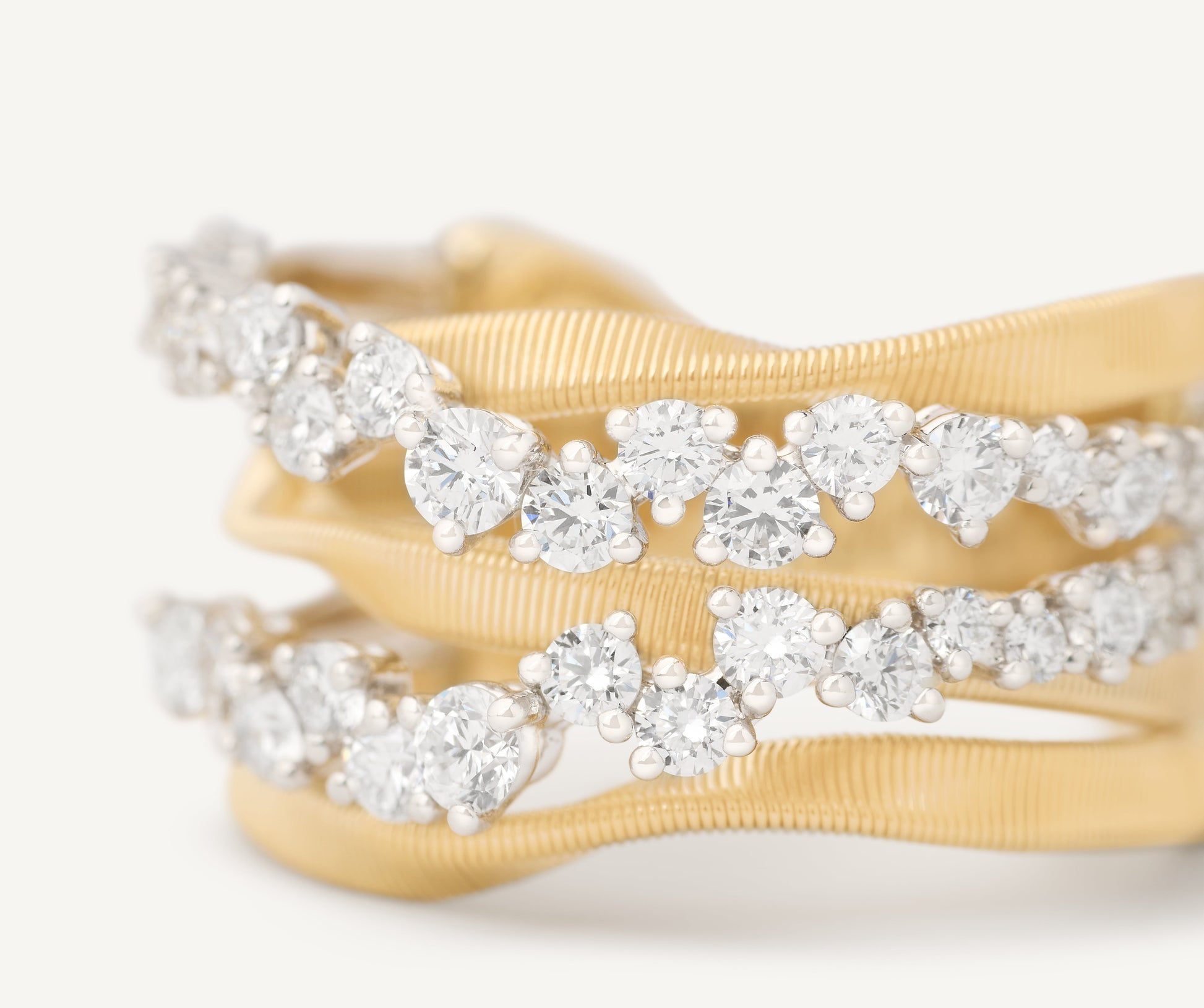 Elegant and refined, this 18kt yellow gold ring showcases three coil strands. A double row of brilliant-cut diamonds, set in an alternating, slightly irregular pattern, creates organic movement and exceptional sparkle. Masterfully set diamonds catch the light from every angle, creating refined accents that exude understated luxury.