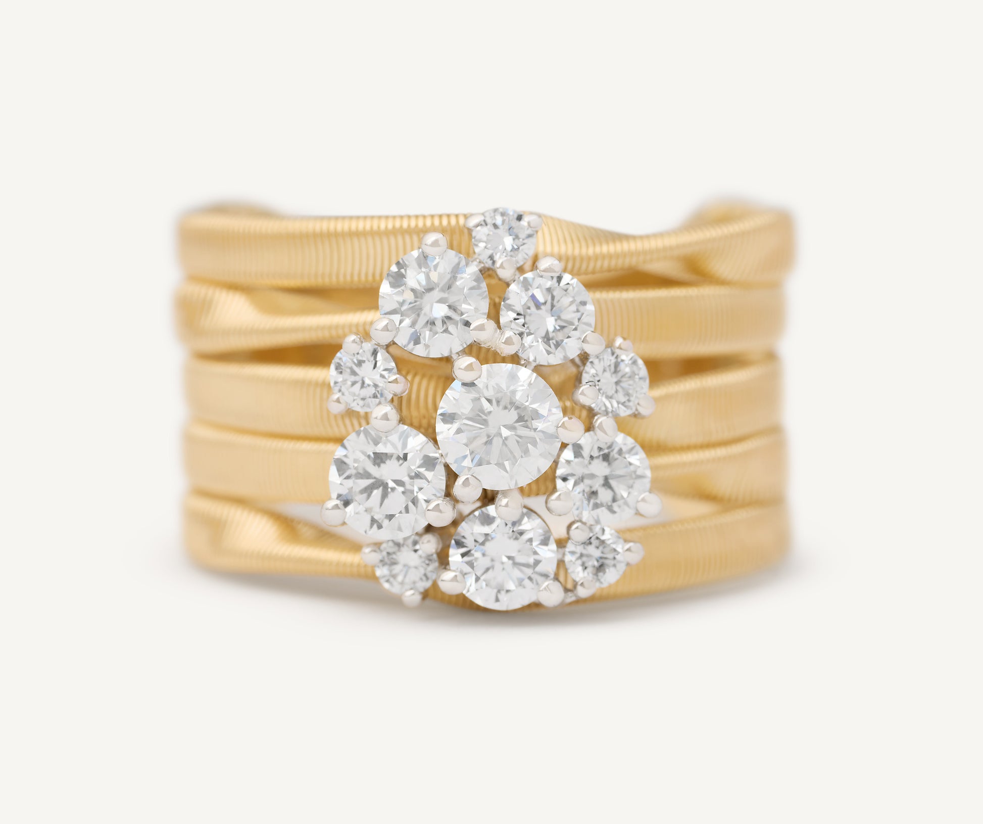 Inspired by nature, this romantic ring showcases a refined balance of light and form. Crafted in 18kt yellow gold using the exclusive coil technique, it features five twisted strands that embrace a radiant brilliant-cut diamond cluster. The irregular composition adds depth and radiance, making it a sculptural piece that blends richness with timeless elegance.