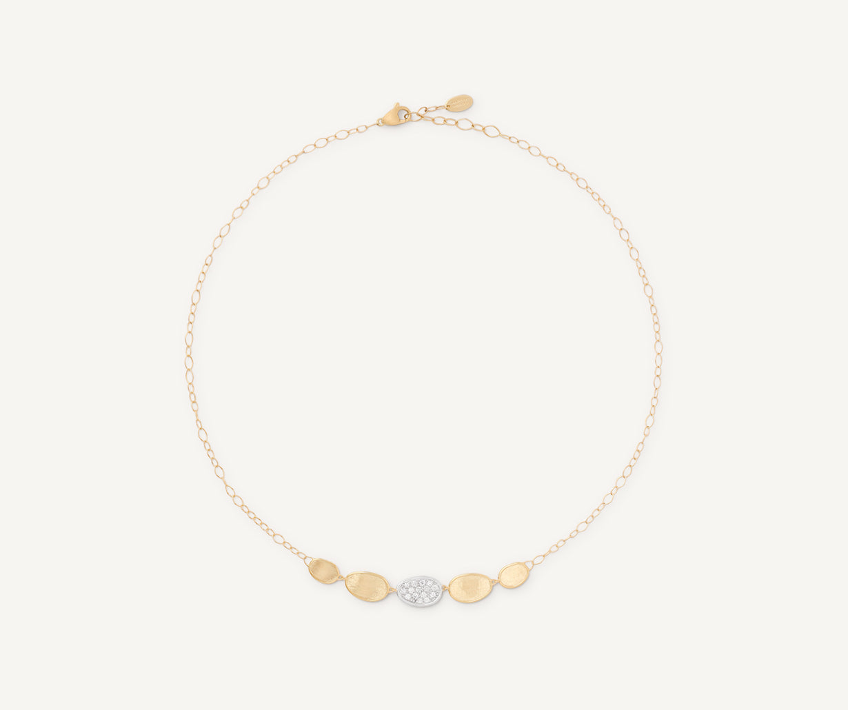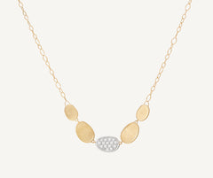 A brilliant cut diamond pav�� leaf shines at the center of this elegant necklace with graduated, irregular shapes. The elements in 18kt yellow gold are engraved by hand with an ancient Florentine technique, providing a discreet, very finely textured surface with a strikingly silky feel. surface.