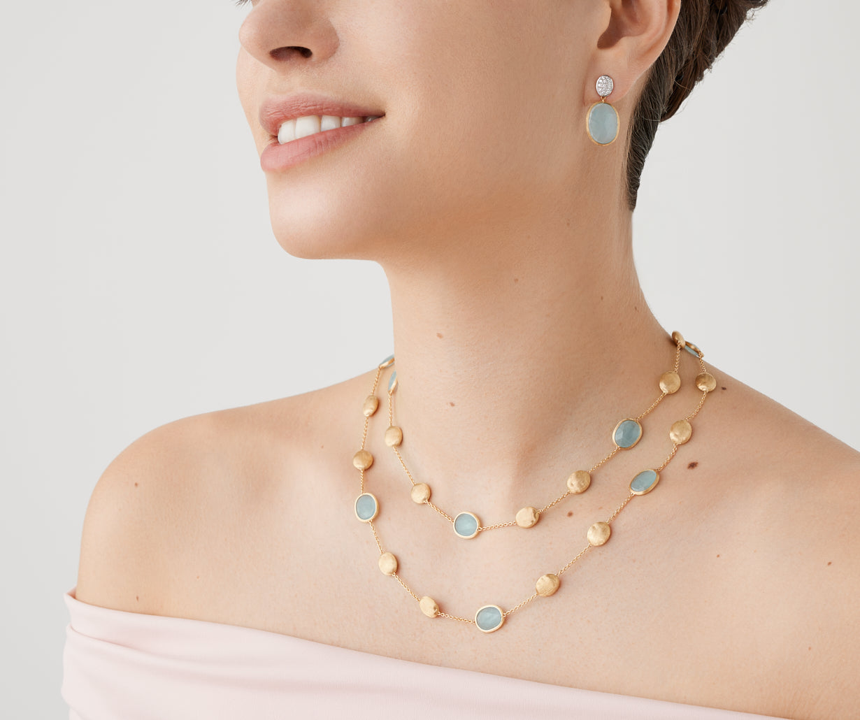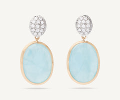 Romantic and feminine, these earrings are the perfect combination of versatility and discreet elegance. The milky aquamarines, set in an 18kt yellow gold bezel finely hand-engraved using the ancient Florentine technique, are enhanced by a pav�� of brilliant-cut diamonds that illuminates the face.