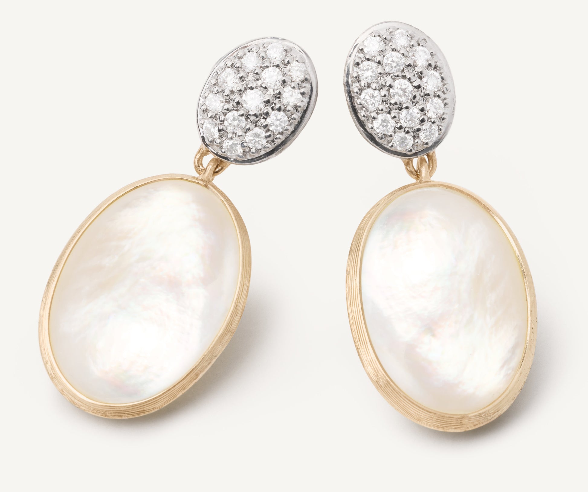 Romantic and feminine, these earrings are the perfect combination of versatility and discreet elegance. The white mother-of-pearl, set in an 18kt yellow gold bezel finely hand-engraved using the ancient Florentine technique, is enhanced by a pav�� of brilliant-cut diamonds that illuminates the face.