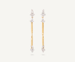 Sculptural and luminous, these long drop earrings feature slender strands of twisted coil in 18kt yellow gold adorned with brilliant-cut diamond clusters. The alternating diamonds create organic sparkle from top to bottom, catching the light with every movement. A refined balance of design and radiant elegance.