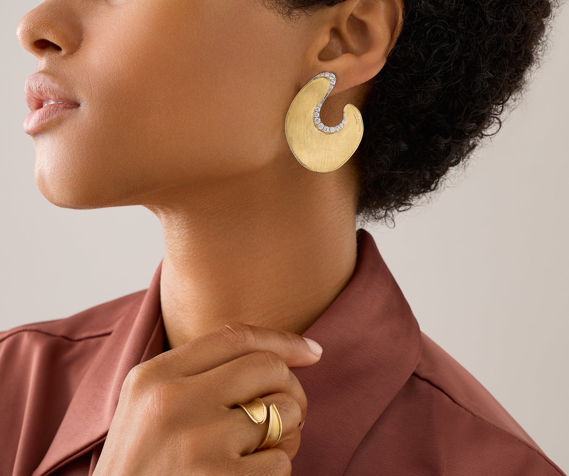 The iconic leaf motif reimagined with a refined twist. Inspired by the organic elegance of nature, these 18-karat yellow gold earrings are finely hand-engraved using the ancient Florentine technique. The organic, lightweight design fits the ear with extraordinary wearability. Embellished with a delicate diamond pav��, the inner profiles reveal a refined and sophisticated brilliance, adding a touch of elegant sophistication.