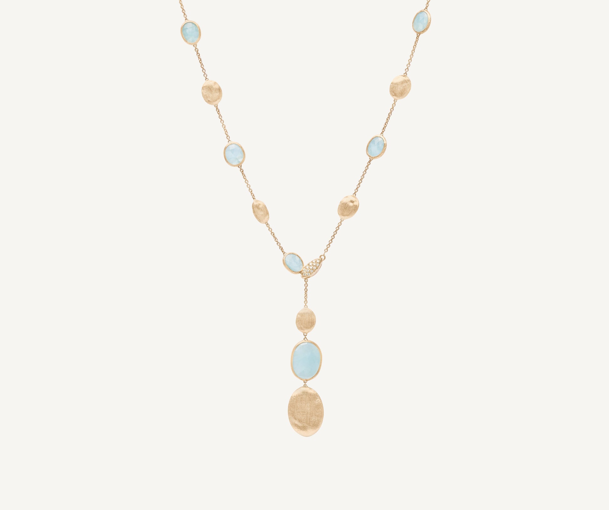 With a fresh and sophisticated look, this lariat necklace alternates carefully selected milky aquamarines with 18kt yellow gold oval elements, finely hand-engraved using the ancient Florentine technique, creating an extraordinary effect of brilliance and silky texture. The diamond pav�� clasp provides the perfect fit and endless possibilities for any neckline, outfit, or occasion.