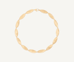 The iconic leaf motif reimagined with a refined twist. This necklace features a sophisticated sequence of irregular 18kt yellow gold leaves gently twisted to create a fluid and sculptural silhouette. Each element is finely hand-engraved using the ancient Florentine technique, enhancing the necklace���s unique design. A timeless expression of sophisticated beauty.