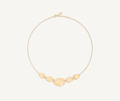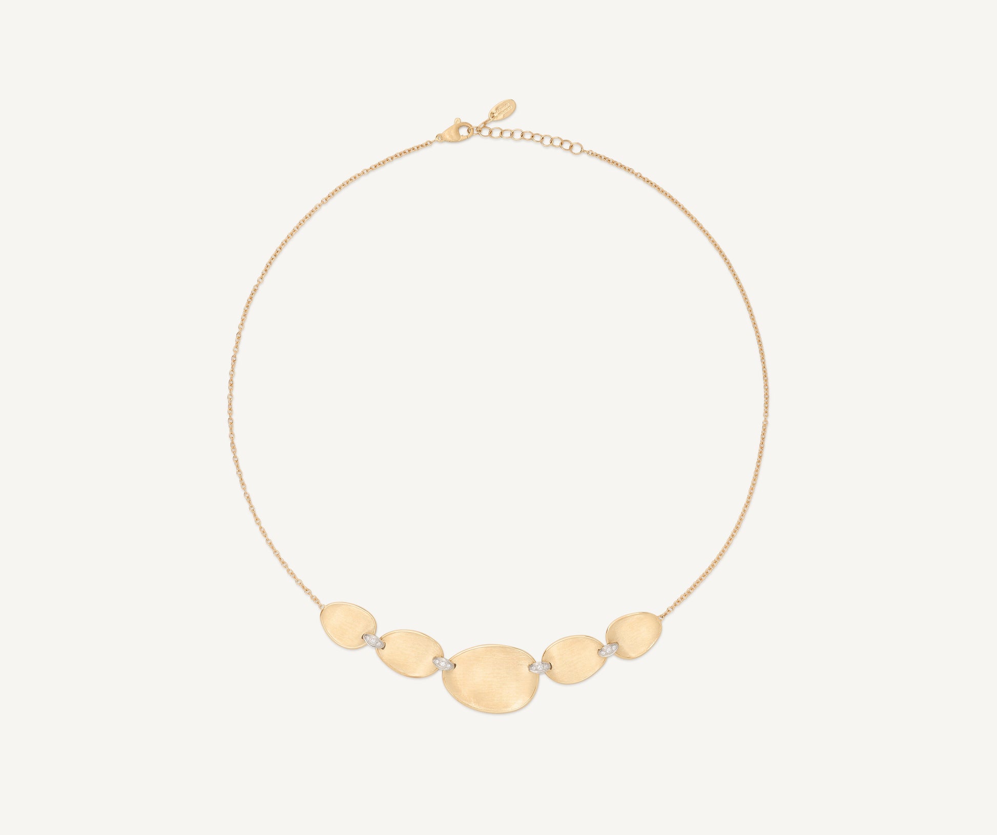 Simply sophisticated, this long necklace alternates a graceful sequence of 18kt yellow gold leaves finely hand-engraved using the ancient Florentine technique with a slender chain. Delicate diamond-accented elements connect each gold leaf, creating a harmonious rhythm of brilliance. This necklace features an adjustable chain, offering a customizable fit for every neckline.