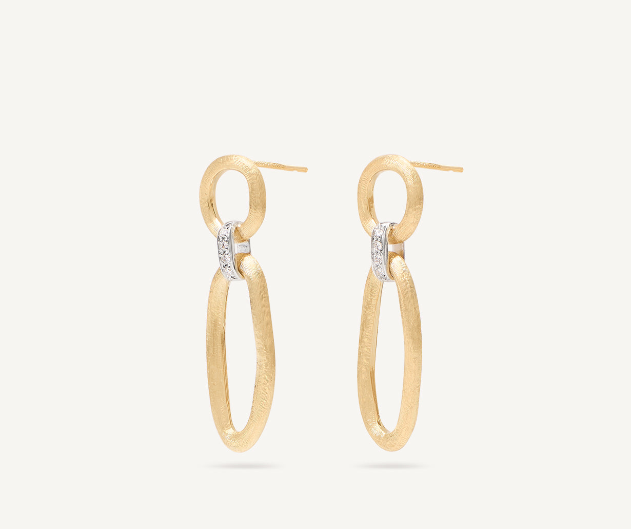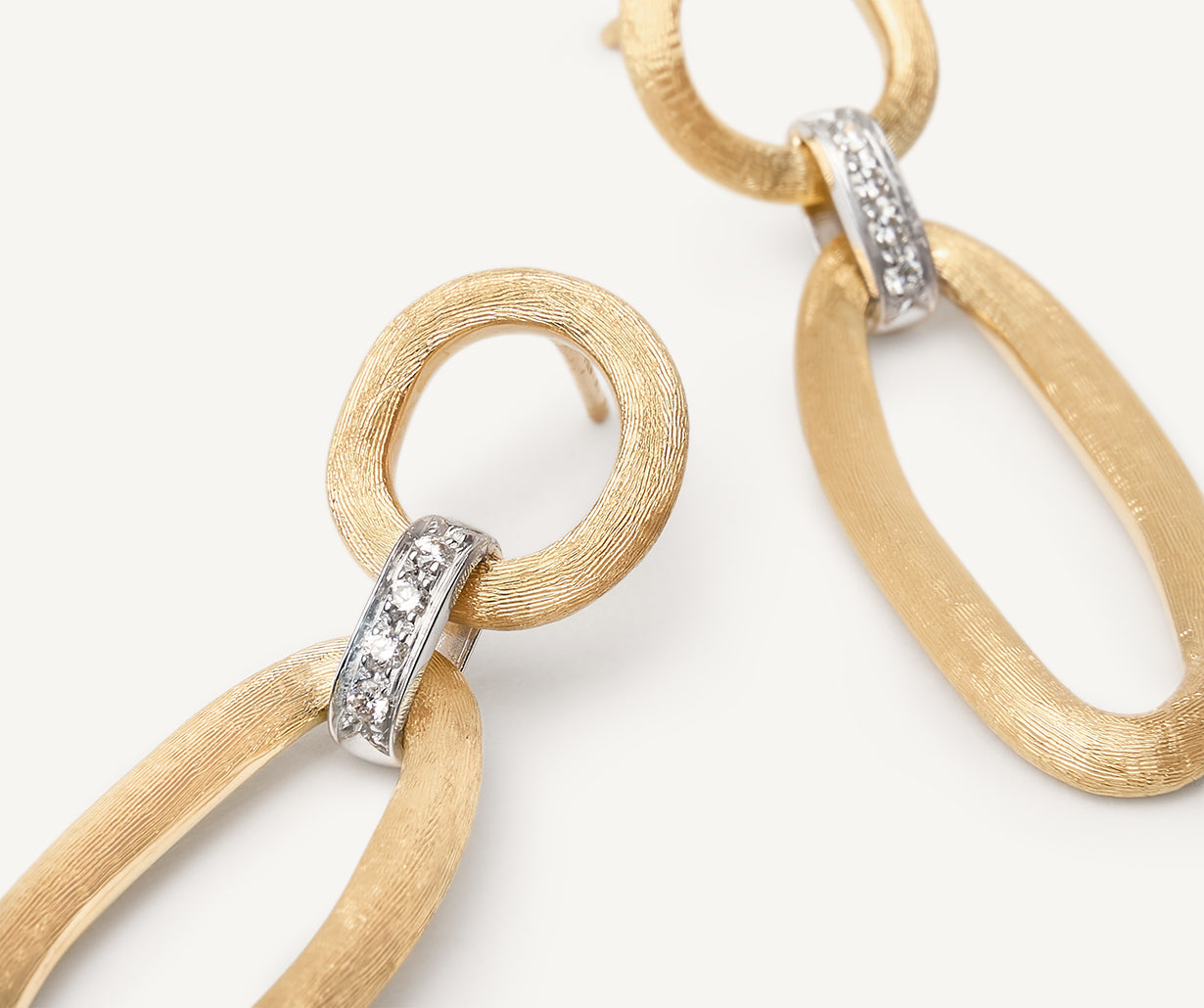 An elegant classic, these 18kt yellow gold earrings feature an irregular hoop and an oval element linked together by a pav�� element of brilliant-cut diamonds. The gold is finely hand engraved using the ancient Florentine technique. A real must-have!