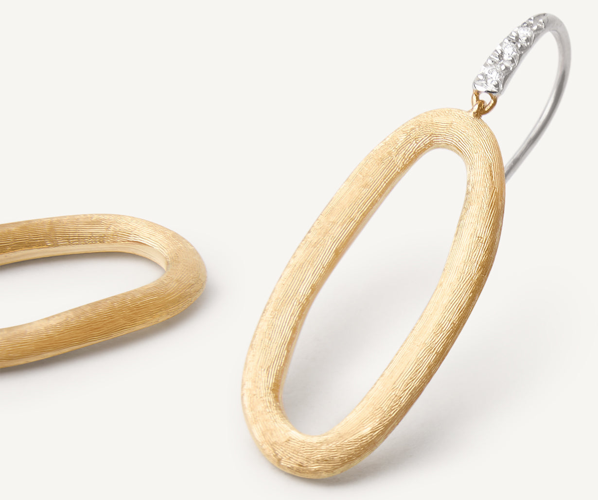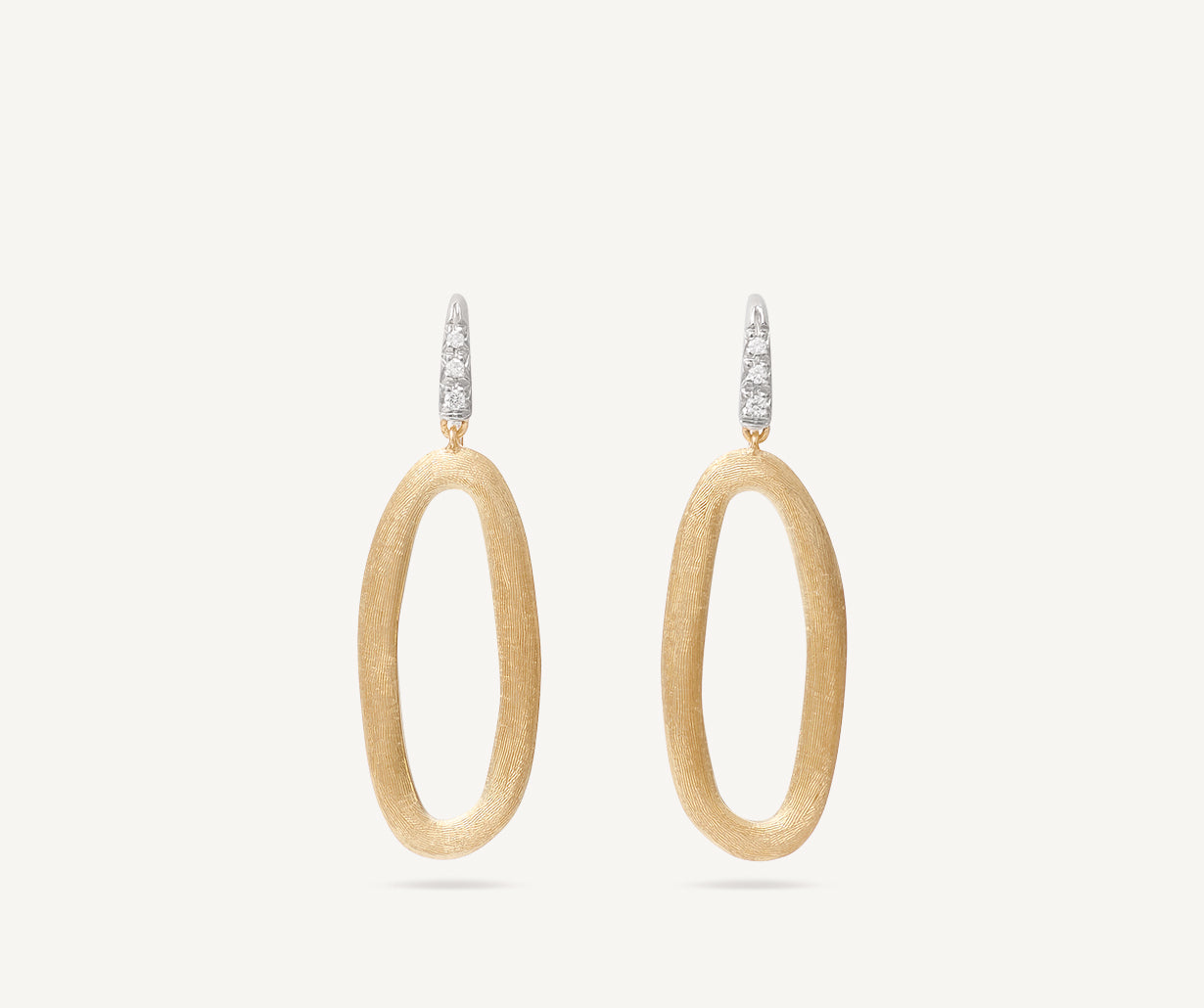 Embellished by a delicate diamond pav�� hook, these irregularly shaped oval pendant earrings are perfect for any occasion. The 18kt yellow gold elements are finely hand-engraved using the ancient Florentine technique.