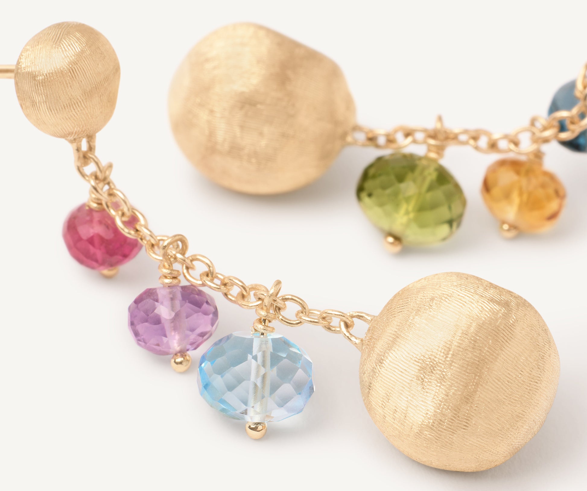 In a perfect interplay of proportions, the colourful gemstones lend character and shine to these 18kt yellow gold short drop earrings. The gold beads are finely hand-engraved using the ancient Florentine technique
