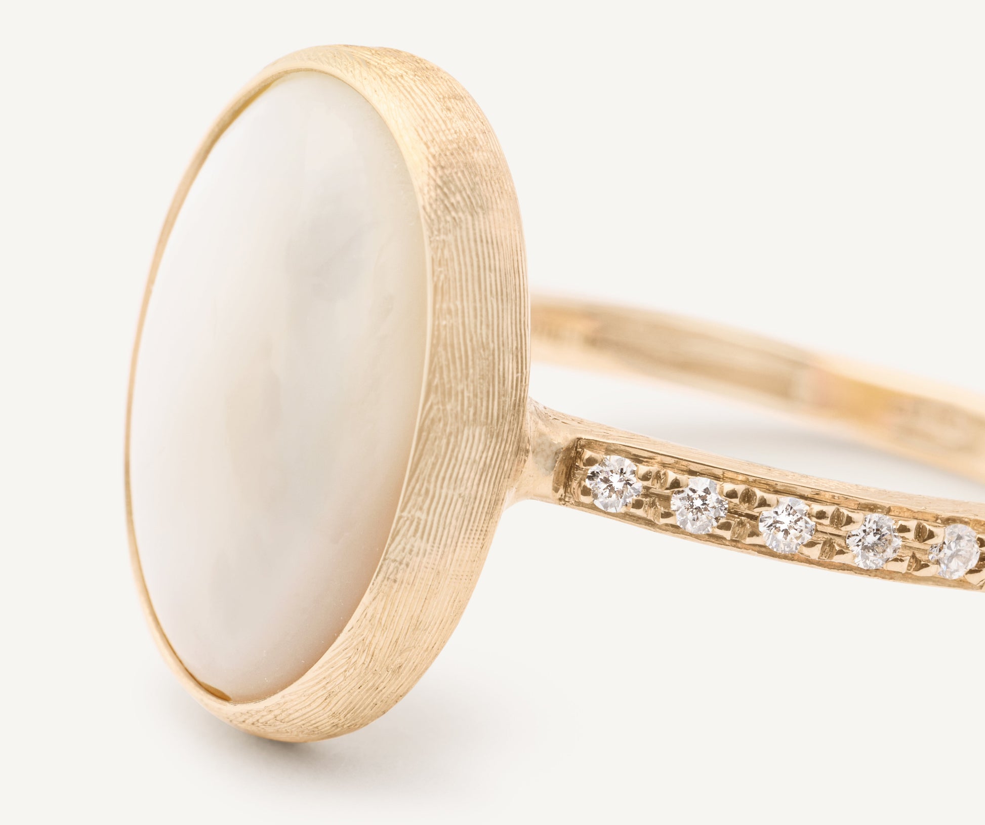 This delicate ring features a central mother-of-pearl set in a 18kt yellow gold bezel finely hand-engraved 18kt using the ancient Florentine technique. The band is adorned with a selection of small brilliant-cut diamonds.
