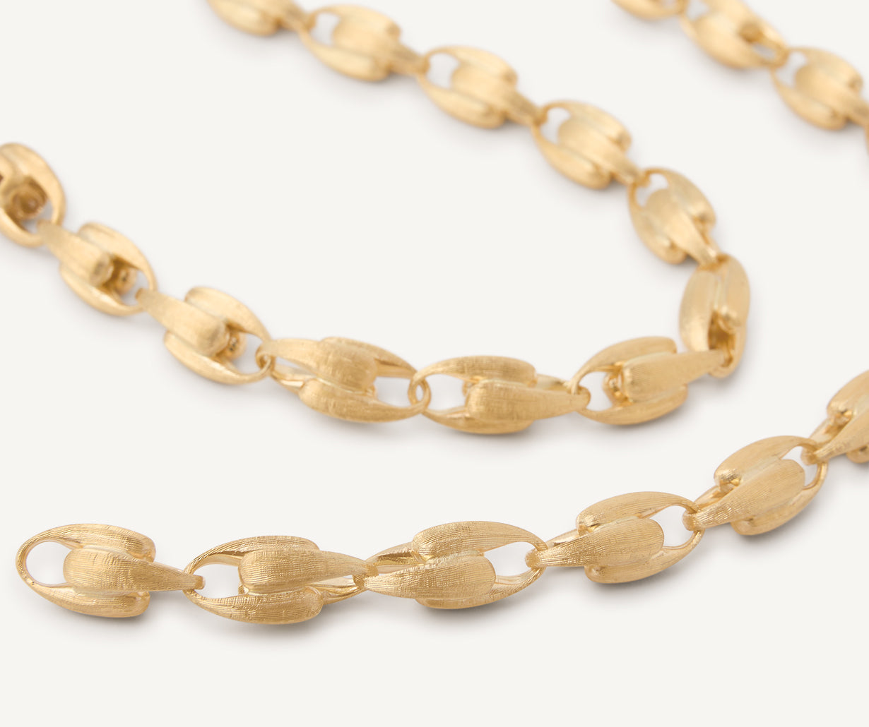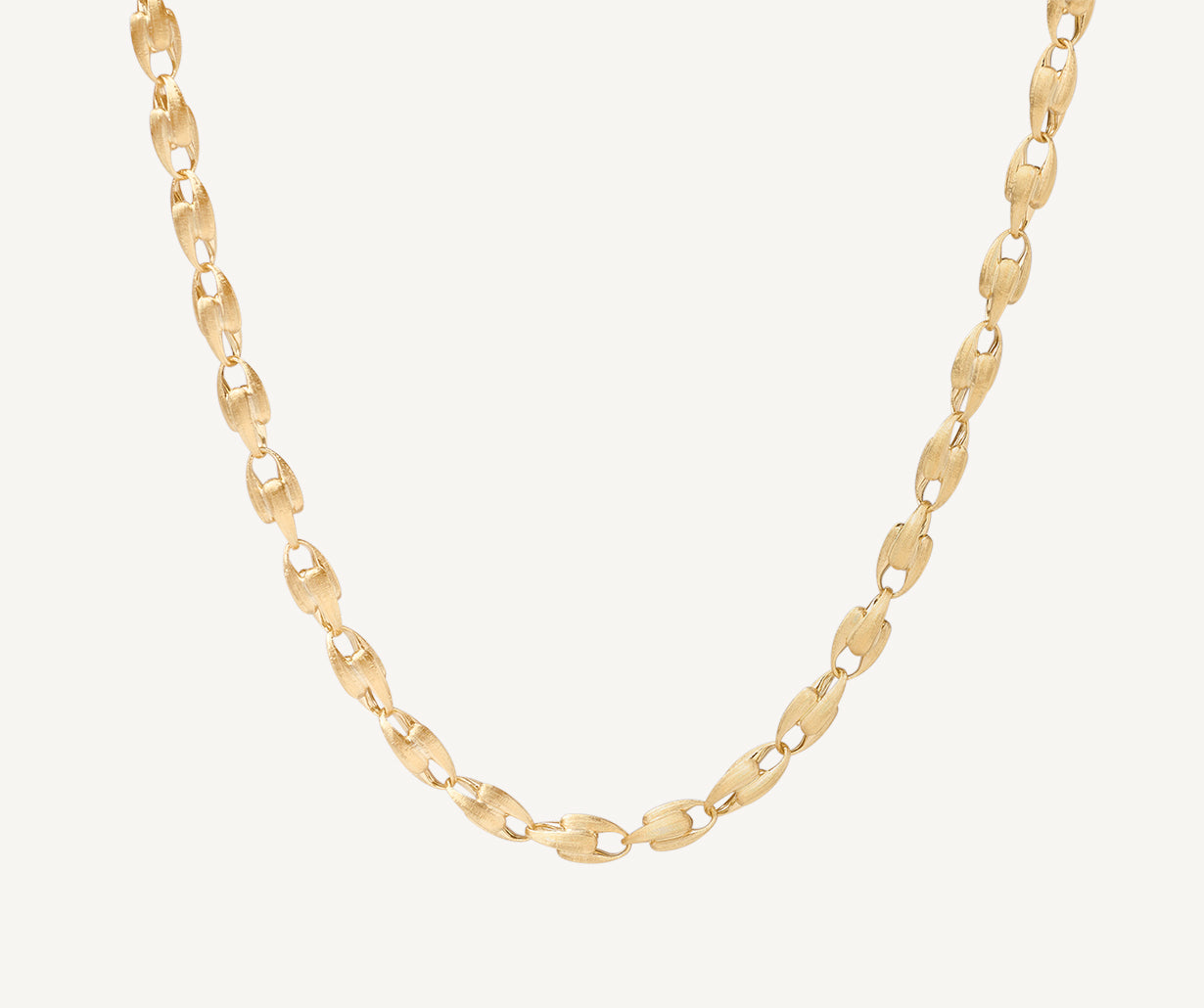 A marvelous 18kt yellow gold necklace consisting of a concatenation of elements composed of each other, an endless embrace. The surface is hand-engraved with the ancient Florentine technique which provides a very tactile finish. A necklace to wear every day, a real must have.