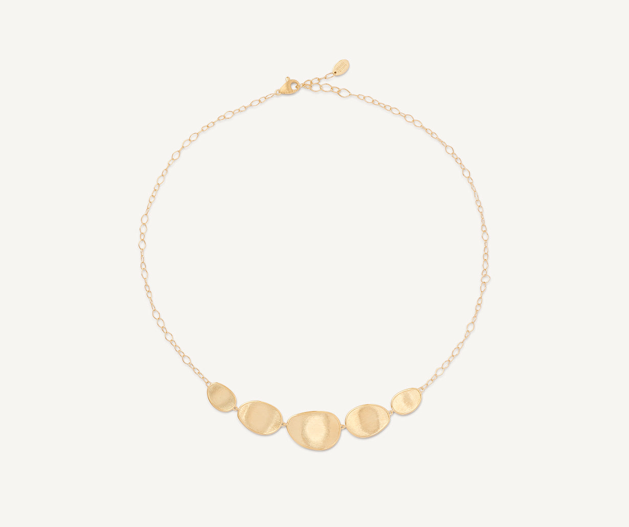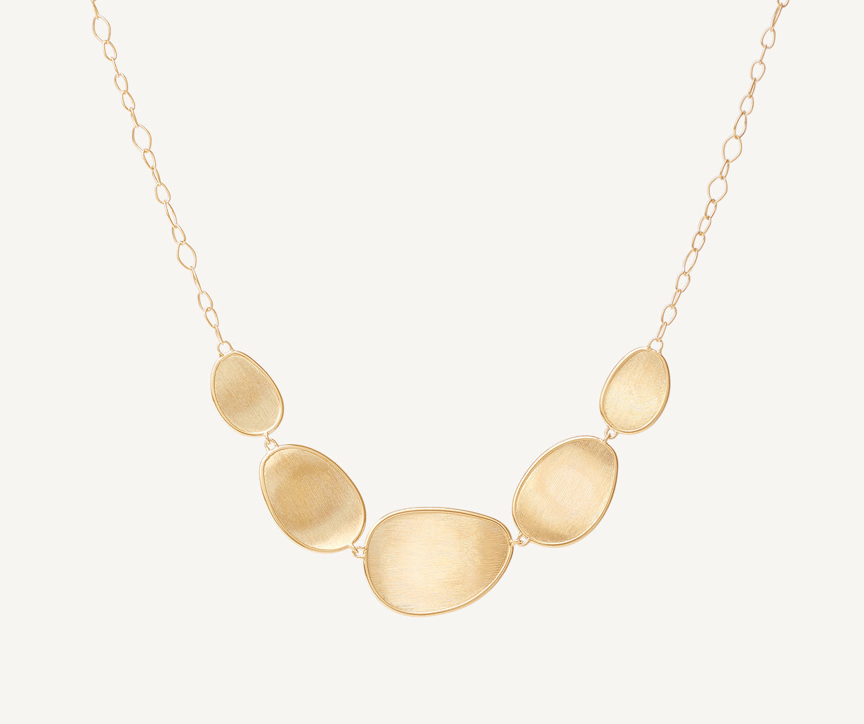 Pendant necklace with an irregular chain and a series of graduated 18kt yellow gold leaves, finely hand-engraved using an ancient Florentine technique, providing a discreet, very finely textured surface with a strikingly silky feel.