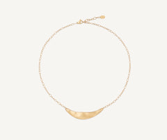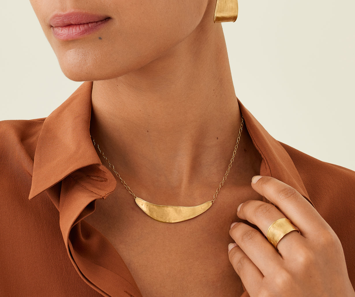 A delicate choker chain with central element in 18kt yellow gold, finely hand-engraved with the ancient Florentine technique and with a deliberately irregular and imperfect shape. An original and striking point of light.