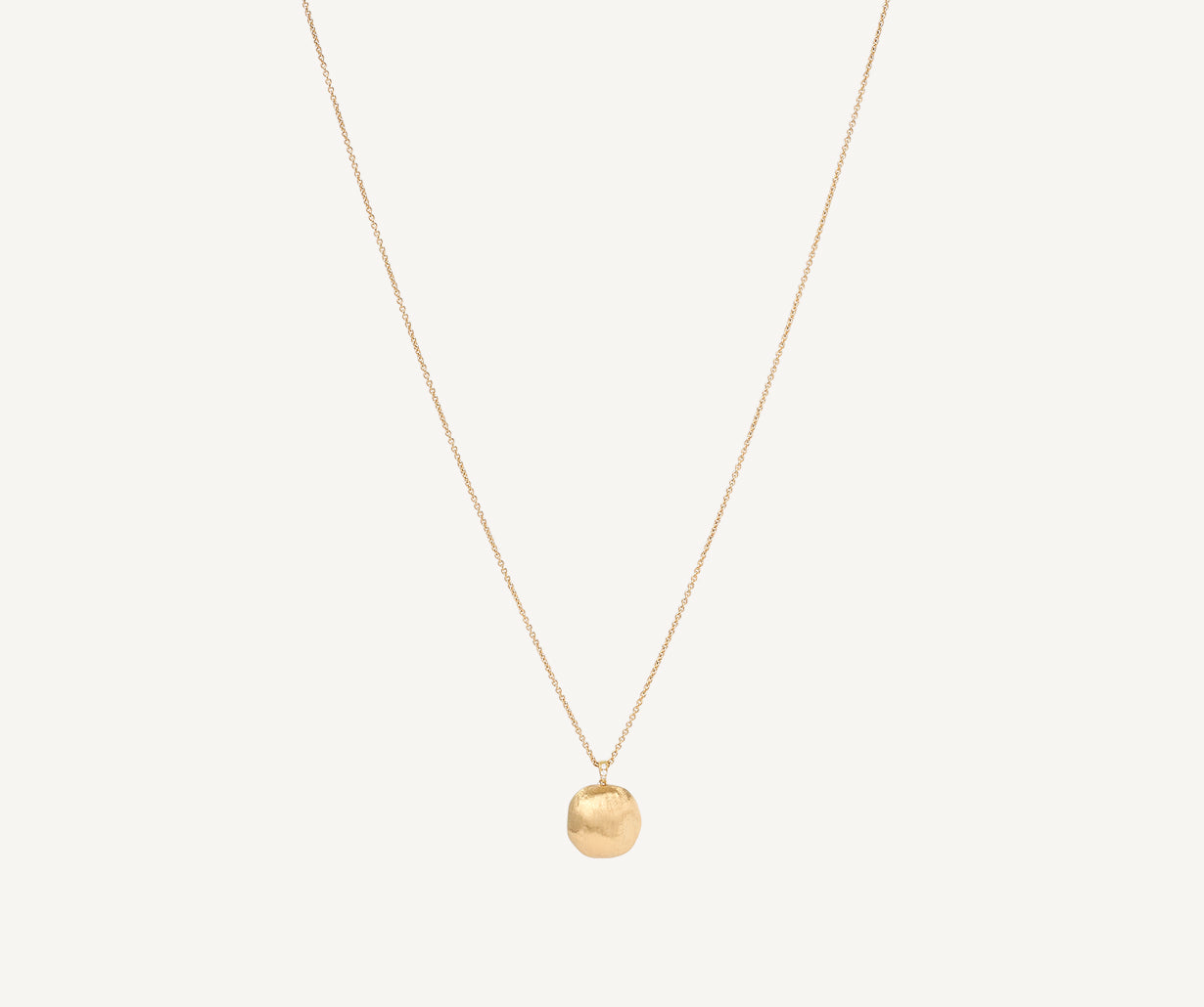 A long 18kt yellow gold link chain and pendant with an irregular, textured surface. The necklace is finely hand-engraved using an ancient Florentine technique and accented with a gold bail studded with brilliant-cut diamonds. An everyday jewelry piece.