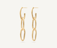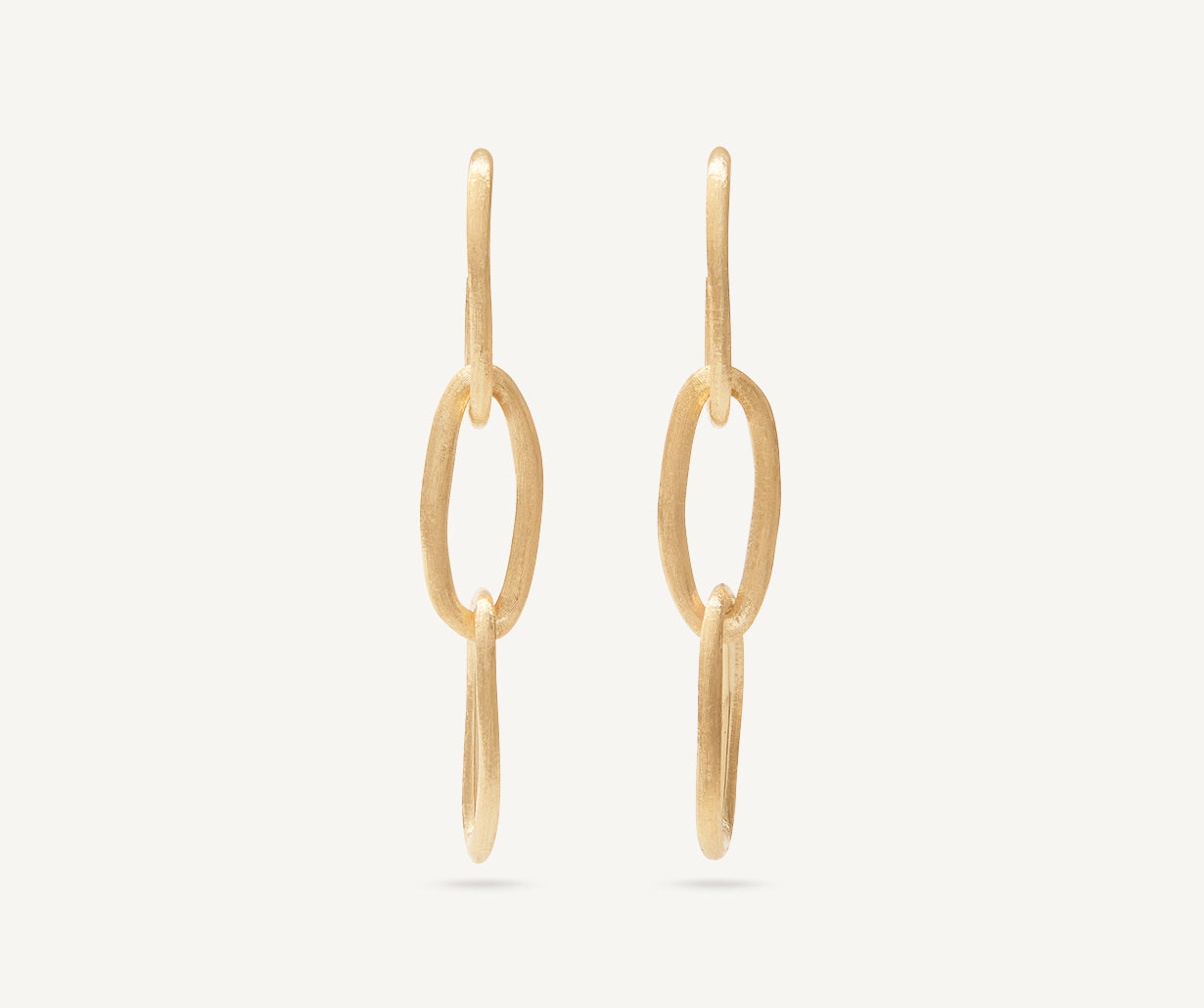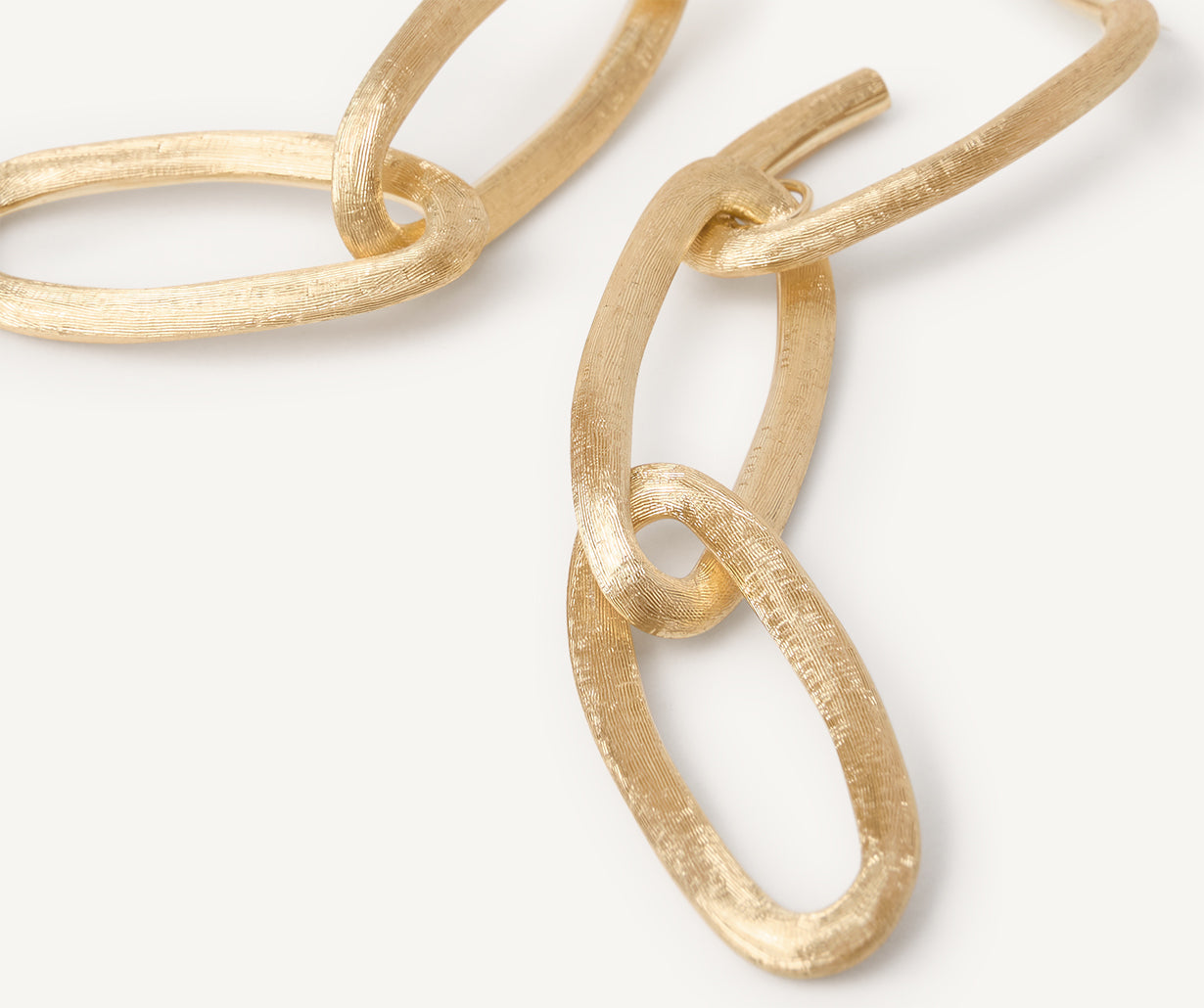 A stylish chain of three interlinked ovals makes up these chandelier earrings in 18kt yellow gold, finely hand-engraved using the ancient Florentine technique. The perfect balance between a statement jewel and the essential and distinctive design of our collections.