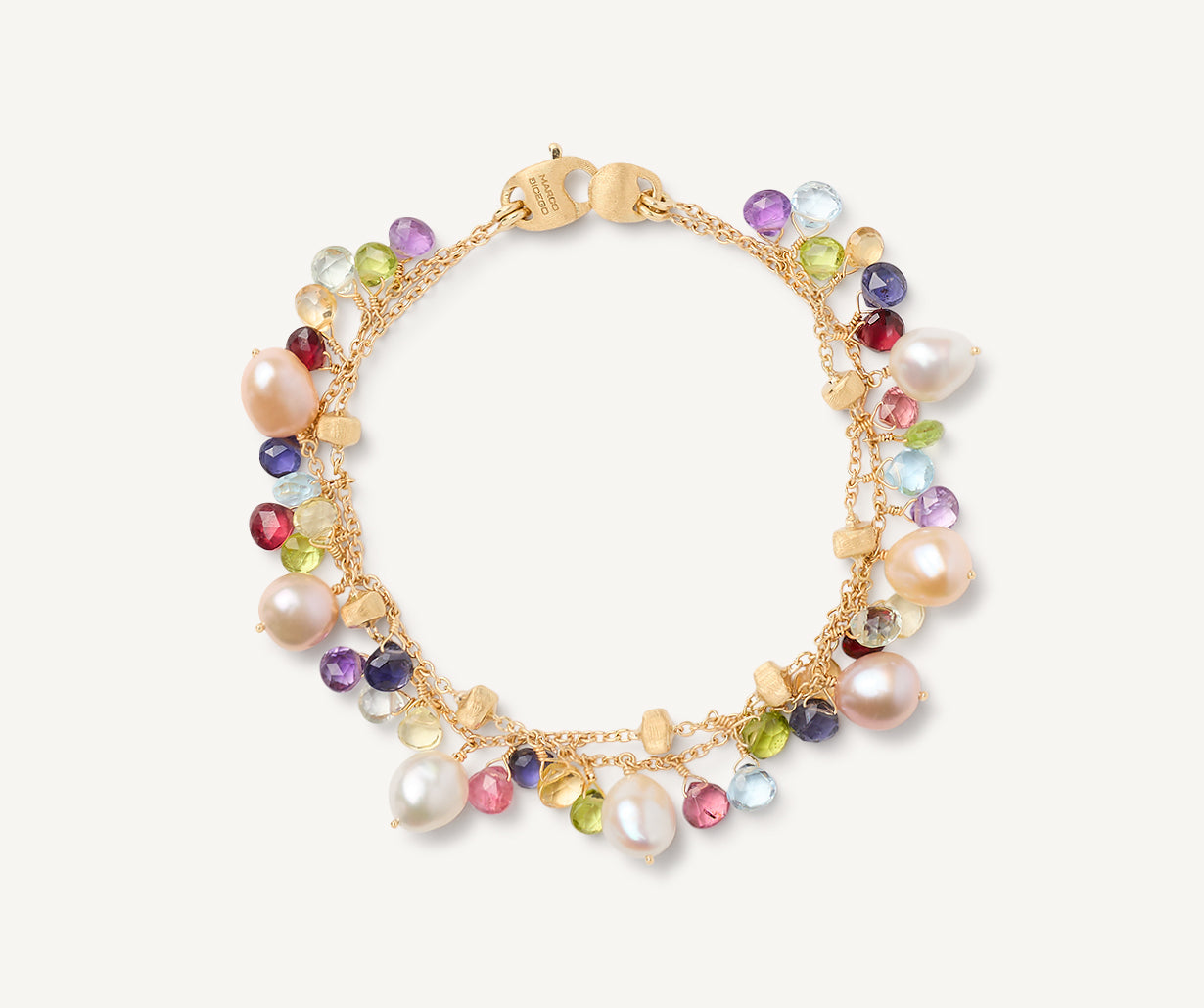 A vibrant mix of colours characterizes this beautiful multi-strand bracelet. The colourful gemstones feature the typical heart-cut, and the multicoloured freshwater pearls stand out for their elegance and lustre. The tiny golden beads are hand-engraved using an ancient Florentine technique.