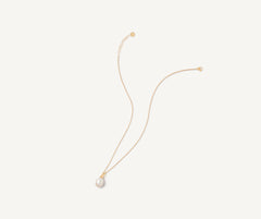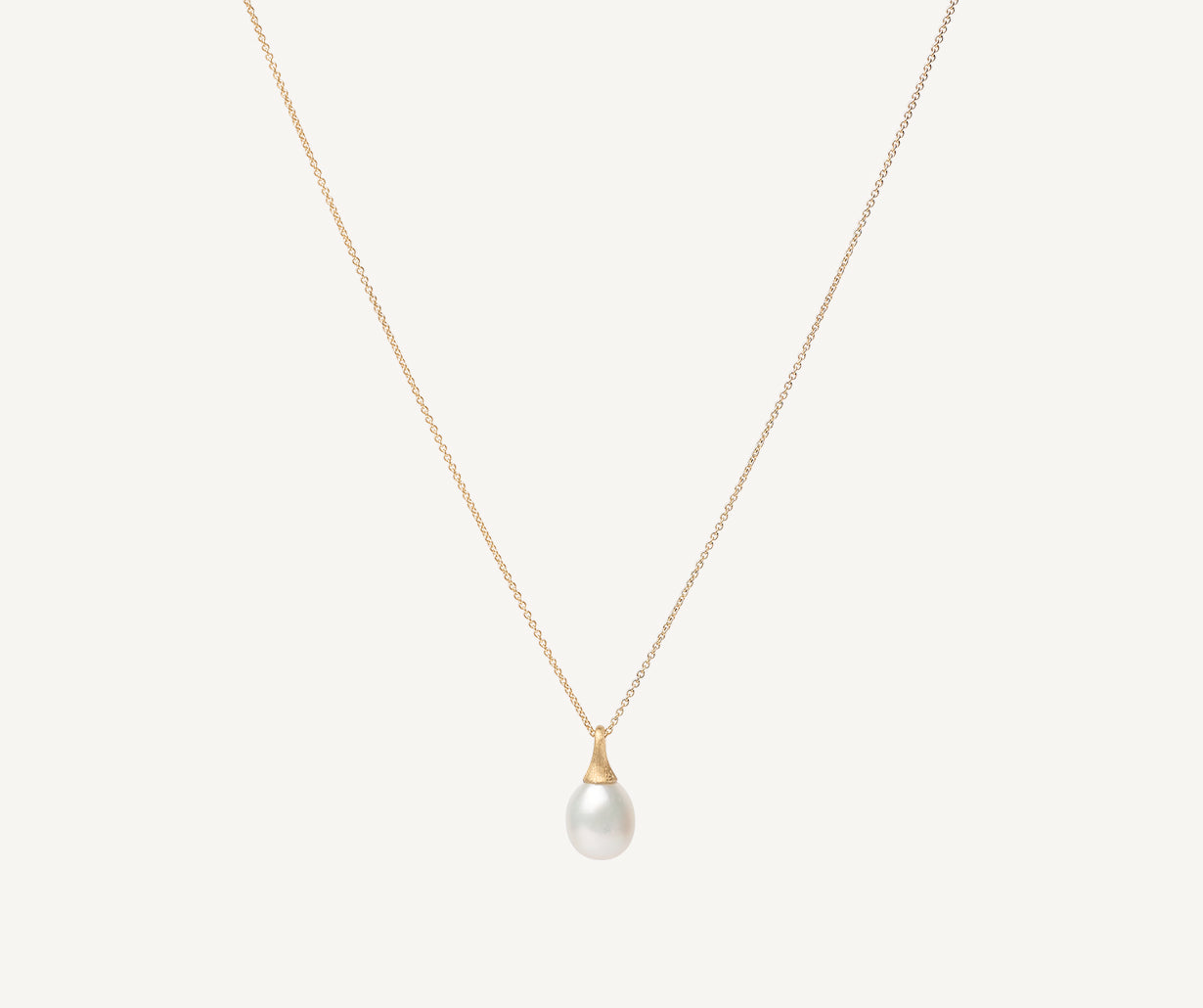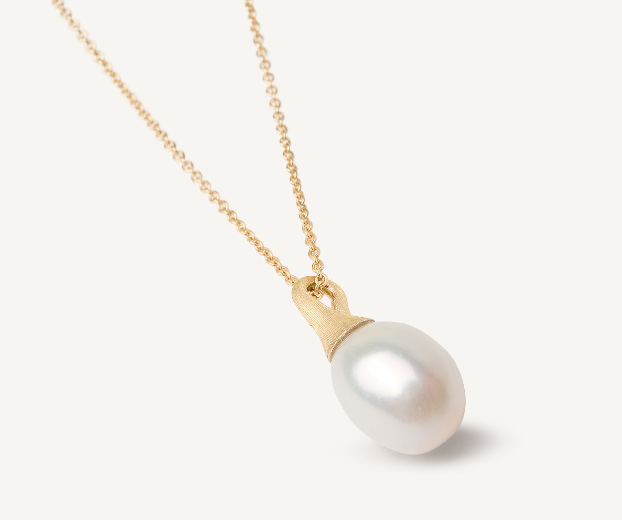 This 18kt yellow gold and pearl pendant necklace is a timeless classic. The delicately elongated gold bail is hand-engraved using an ancient Florentine technique. The adjustable length provides the perfect fit and endless possibilities for any neckline, outfit, or occasion.