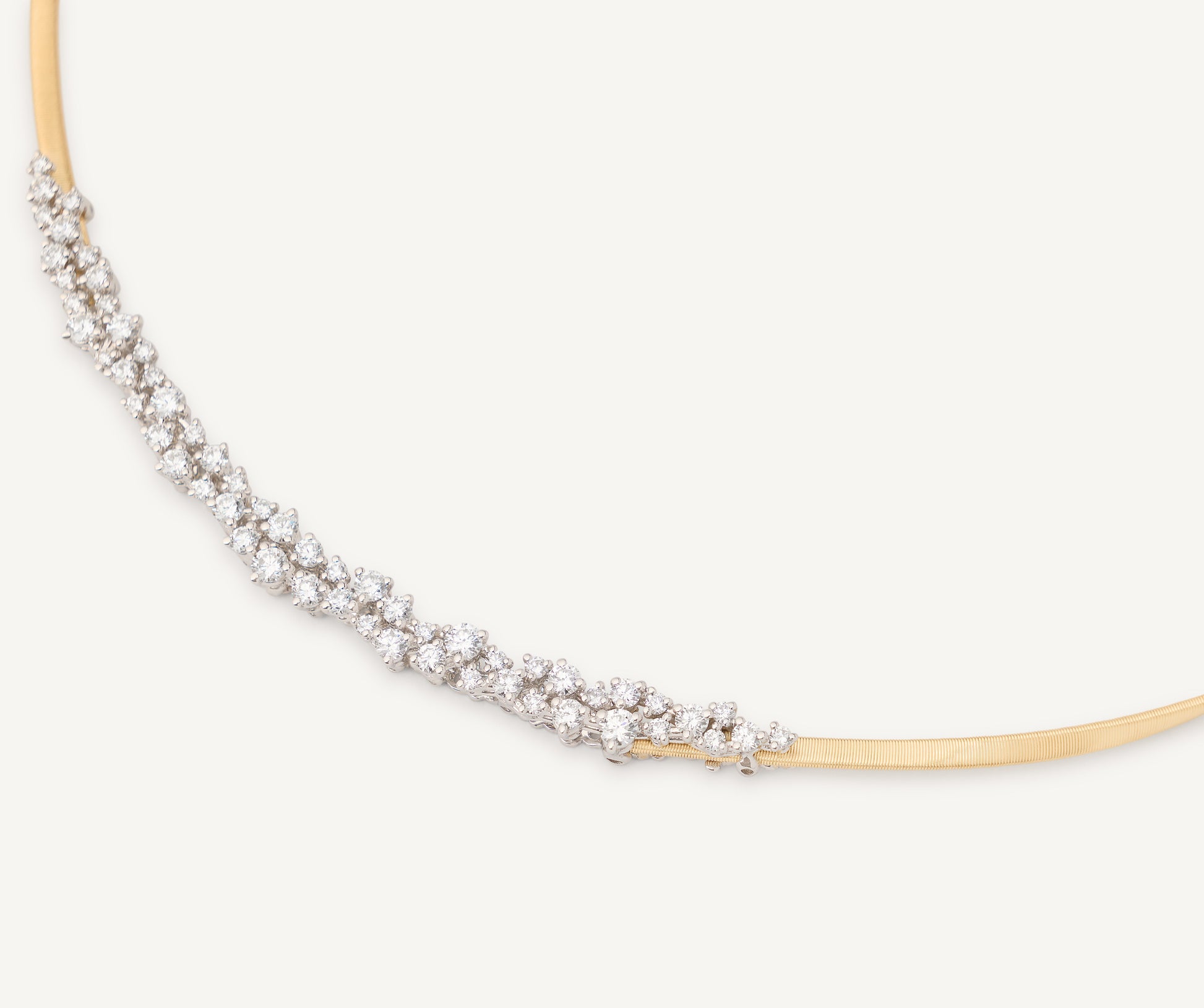 A refined blend of texture and brilliance, this 18kt yellow gold necklace features a single strand carefully crafted using the exclusive coil technique and accented by a graduated cluster of brilliant-cut diamonds. The diamonds shimmer with organic movement, set against the gold���s distinctive texture, creating refined accents that exude understated luxury.