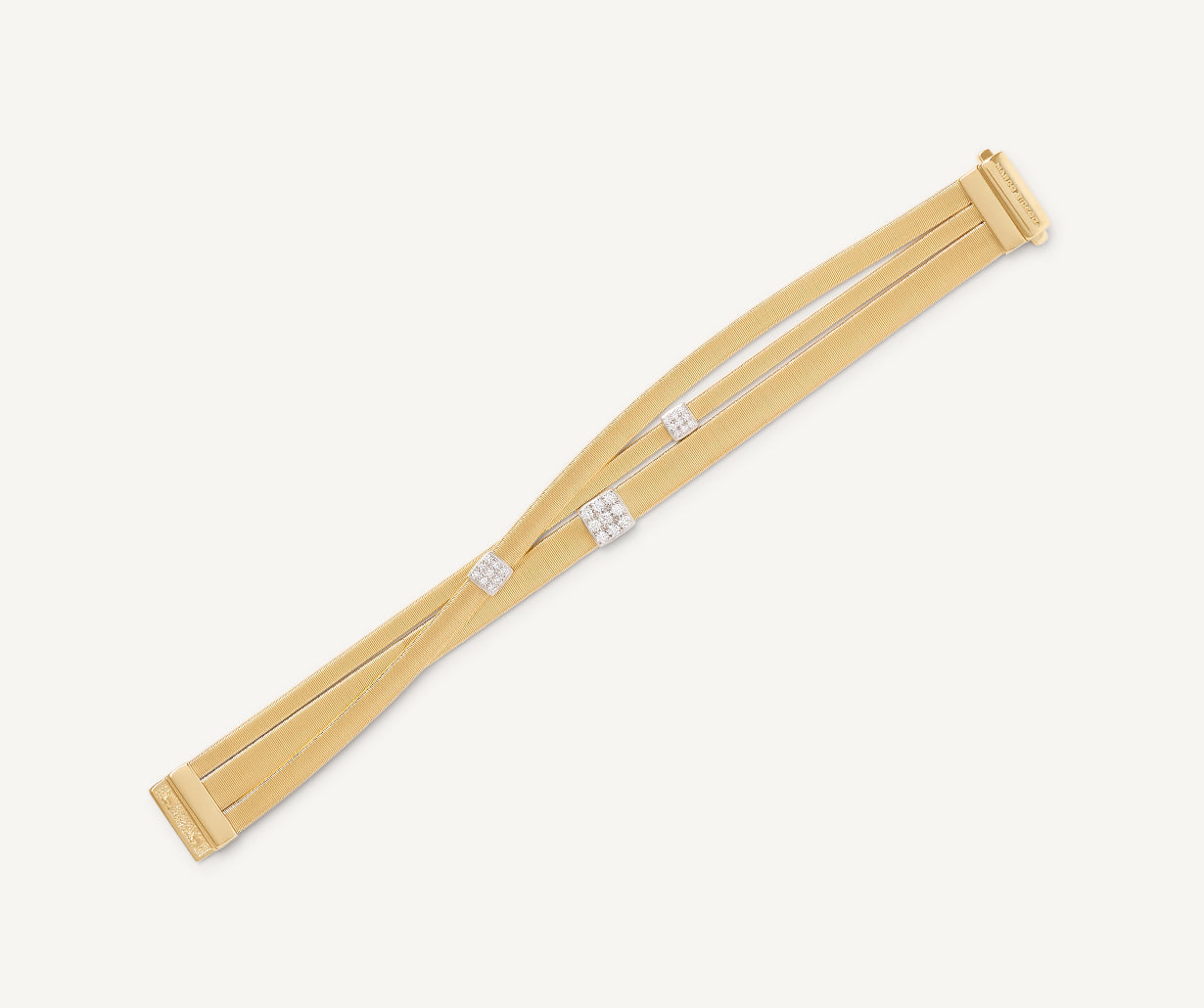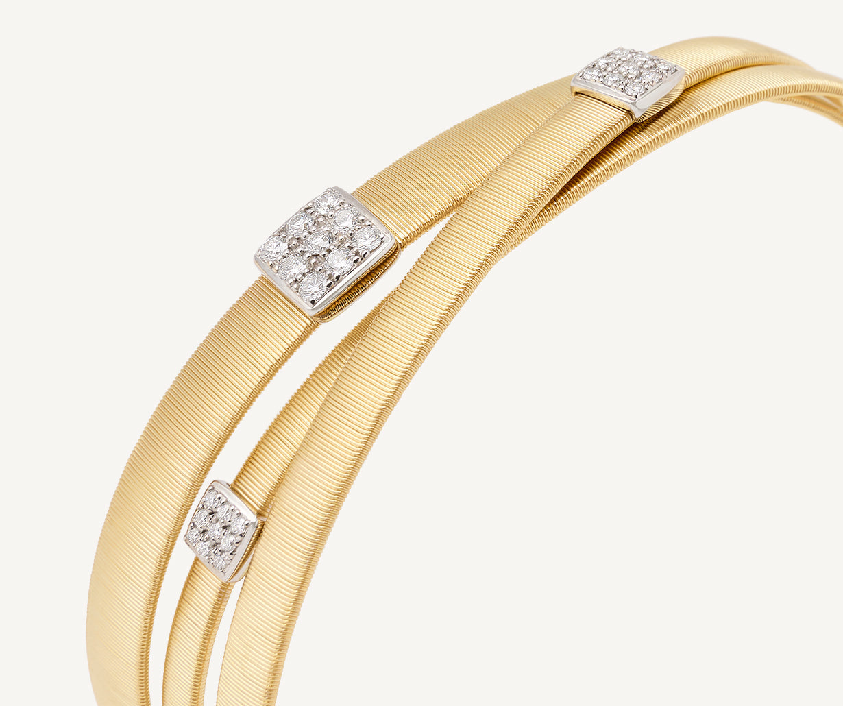 This beautiful multi-strand flat coil bracelet is characterized by its bold elegance. Crafted in 18kt yellow gold, it features three stations of genuine pav�� diamonds and stands out for its unique wearability. The epitome of contemporary elegance.