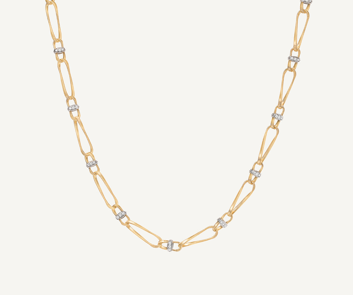 In this elegant collar, fine 18kt yellow gold strands crafted with our exclusive coil technique create captivating figure-eight shapes, joined together with pav�� diamonds to gently capture and reflect natural light.
